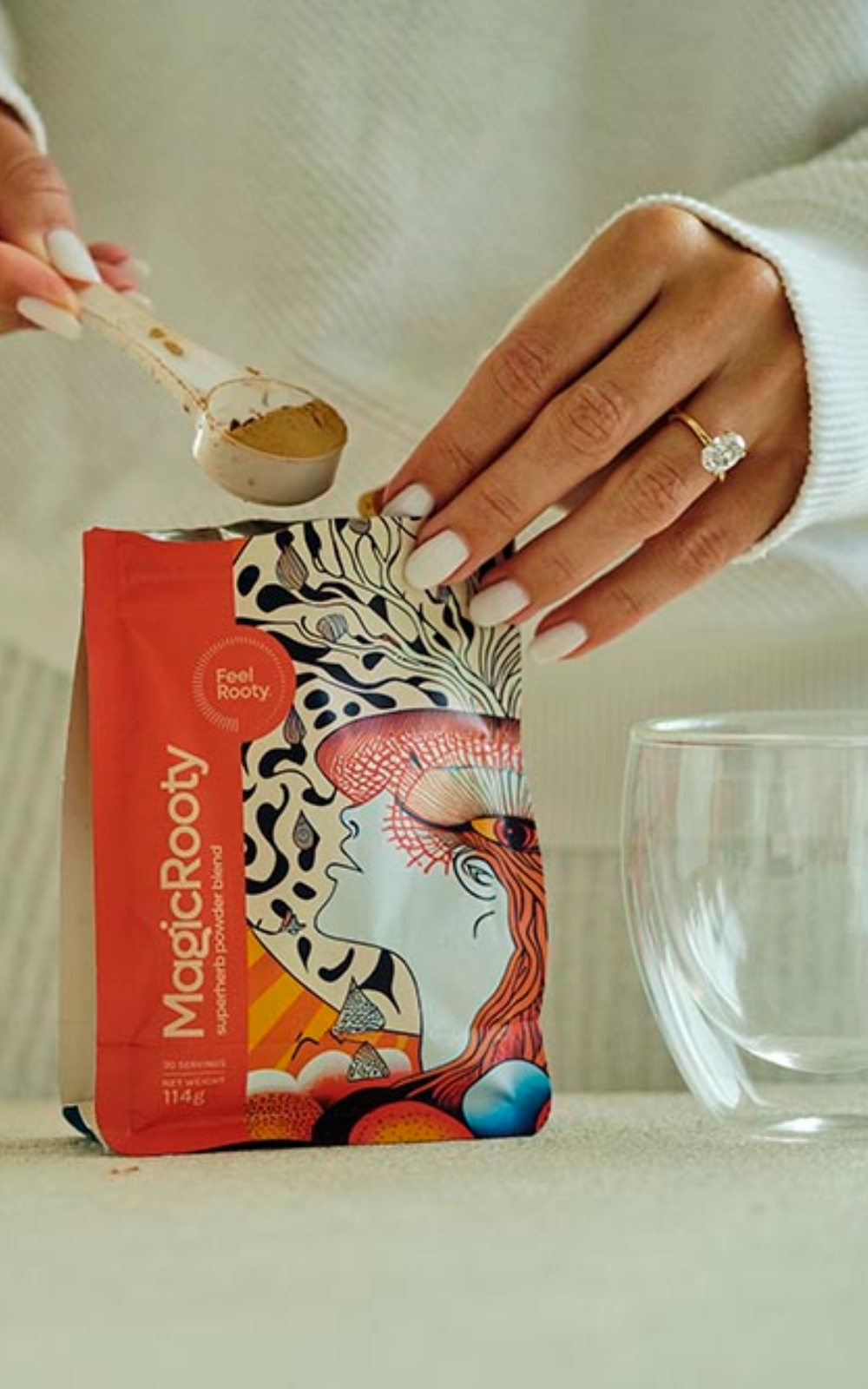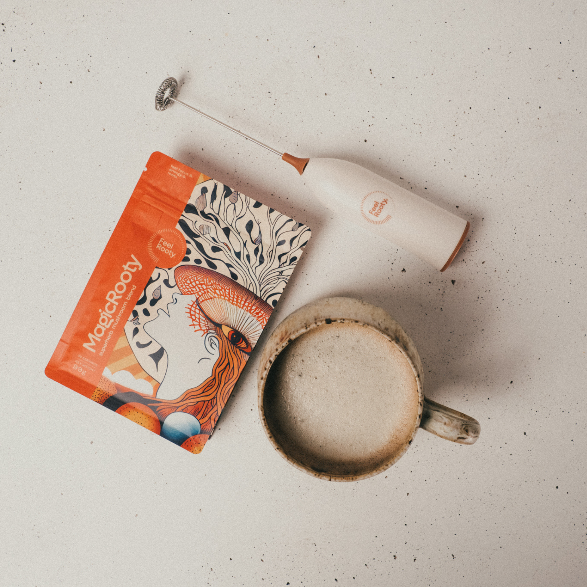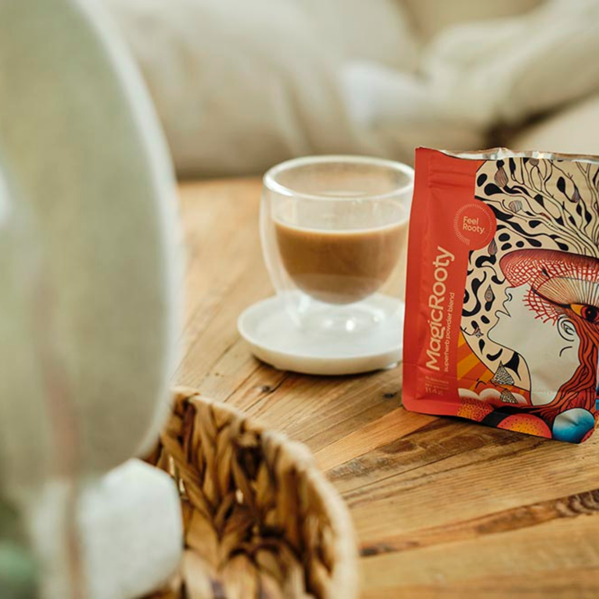 V MagicRooty so sestavine, pridobljene iz različnih koncev sveta: vsebuje medicinski gobi (resasti bradovec in kordiceps), adaptogena zelišča (rožni koren in alpinia galanga), yerba mate čaj, vitamin B3 iz ajde, maco in kakav.