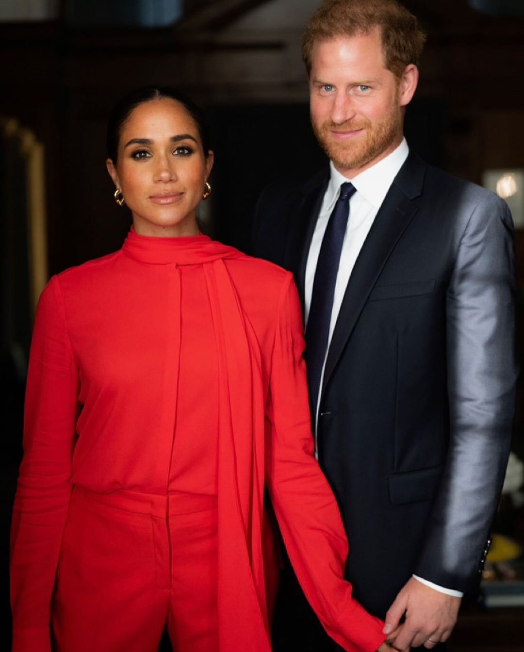 Na eni fotografiji Meghan žari v rdečem kompletu, Harry pa je uglajen v temno modri obleki s kravato. Par se nežno drži za roko in koketira s kamero.