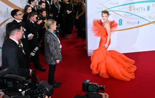 V prosojni oranžni kreaciji presekala dolgočasno črnino baft