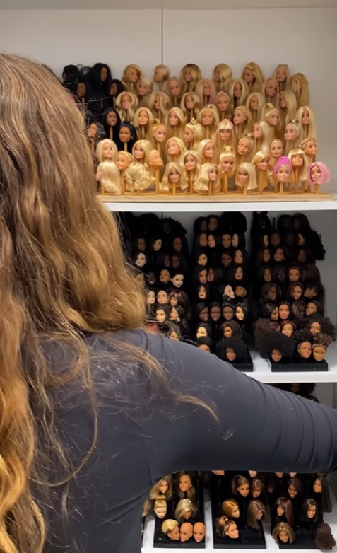 Najprej je odprla omaro, v kateri ima shranjenih kakšnih 300 različnih glav barbik, od blond do temnih, pa takšnih s kitkami, pink lasmi in afro kodri. Odločila se je za dve barbiki, ki jima je nato izbrala še modni opravi. Odpirala je predal za predalom, kjer je shranjenih ogromno različnih oblačil in čevljev, ki so razporejeni po barvah.