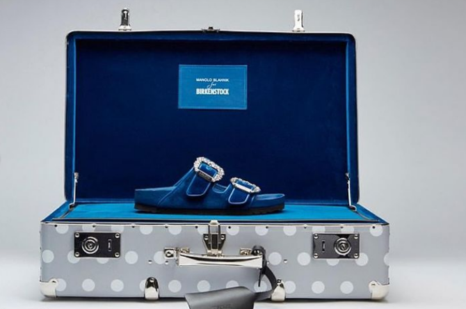 Priljubljena znamka obutve Birkenstock je združila moči s prestižno znamko čevljev Manolo Blahnik. Prepoznavne modele natikačev Arizona in Boston clog so oblekli v temno moder žamet in jim dodali prepoznavno Blahnikovo kristalno zaponko.