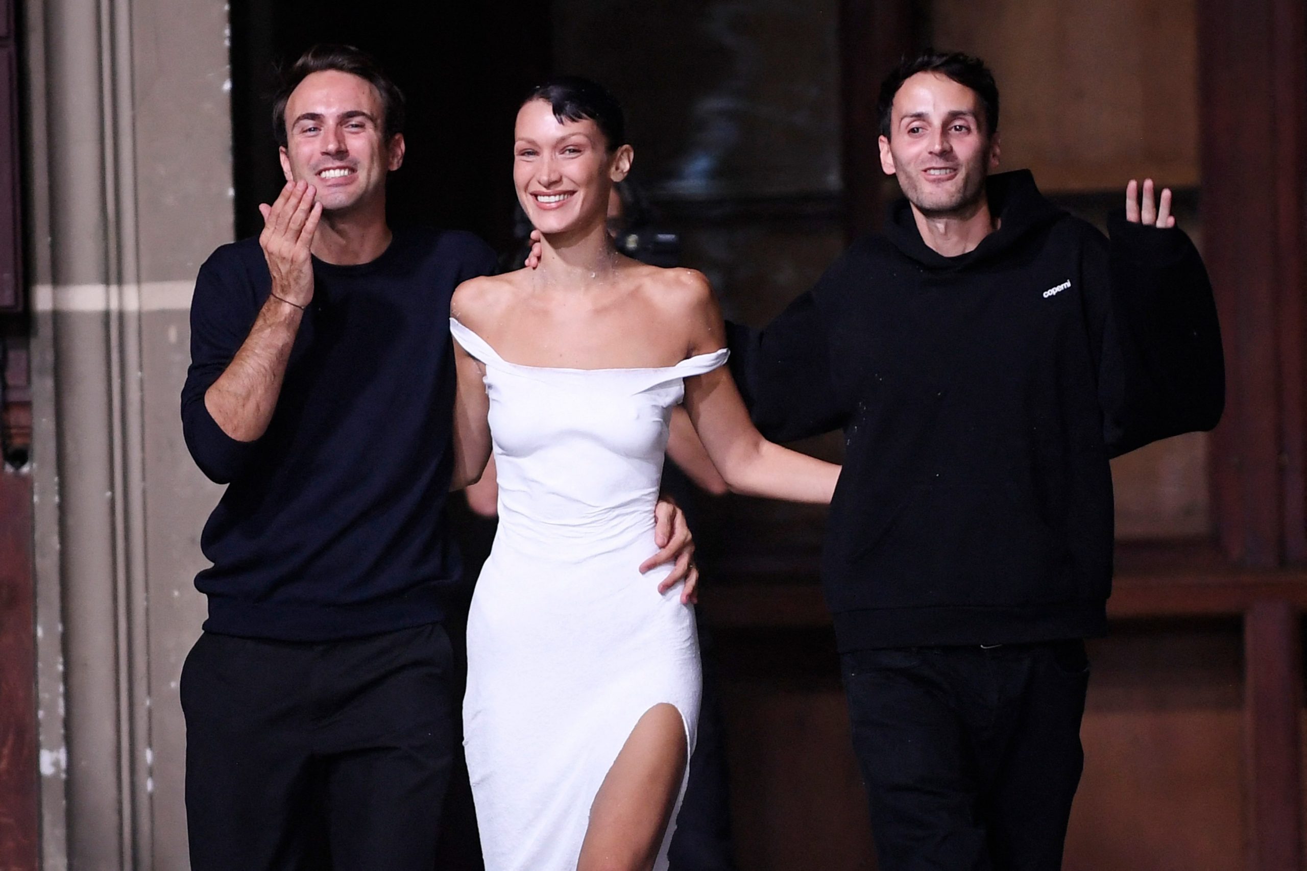 Bella Hadid se je sprehodila po modni brvi, oblečena zgolj v kožne tangice, gole prsi pa si je prekrivala z dlanmi. Ko je prišla do konca brvi, sta dva moška začela njeno telo škropiti z nečim, kar je bilo videti kot bela barva.