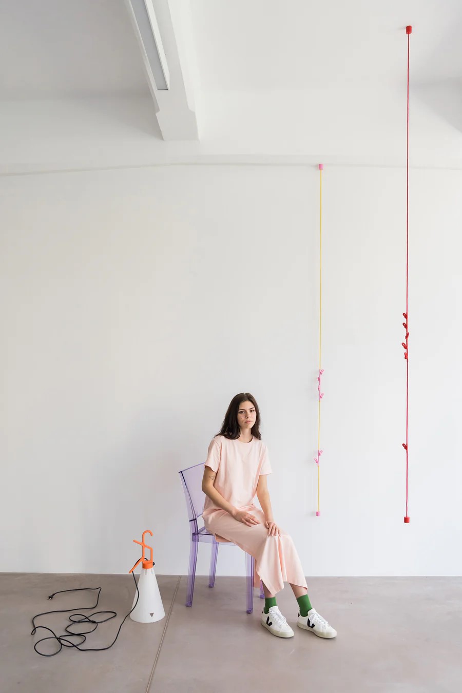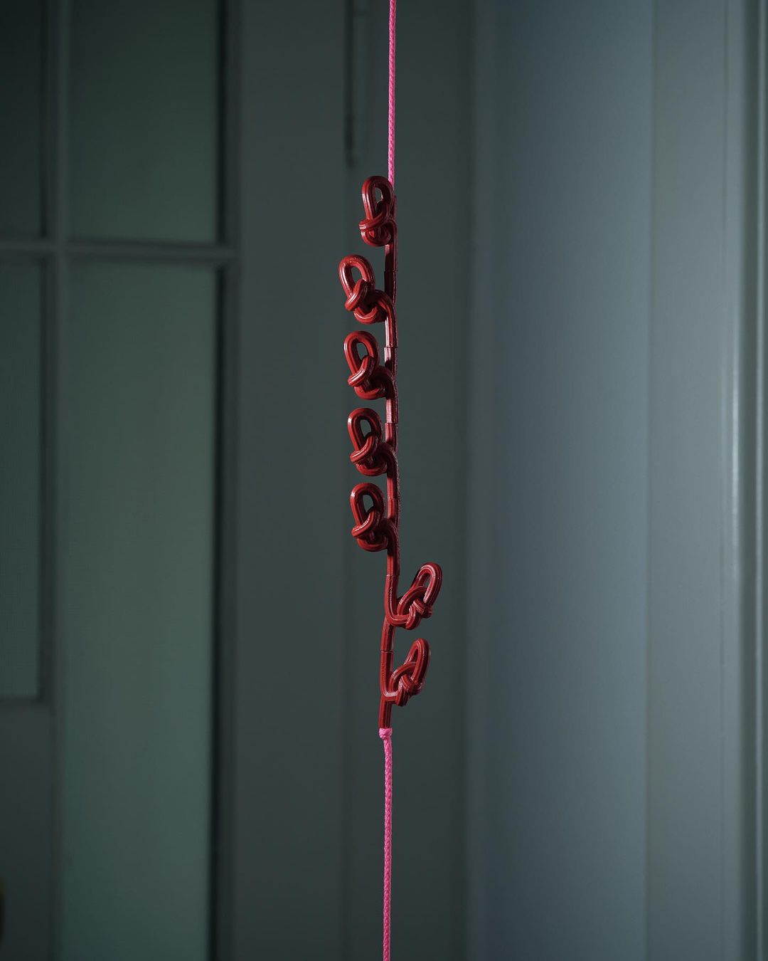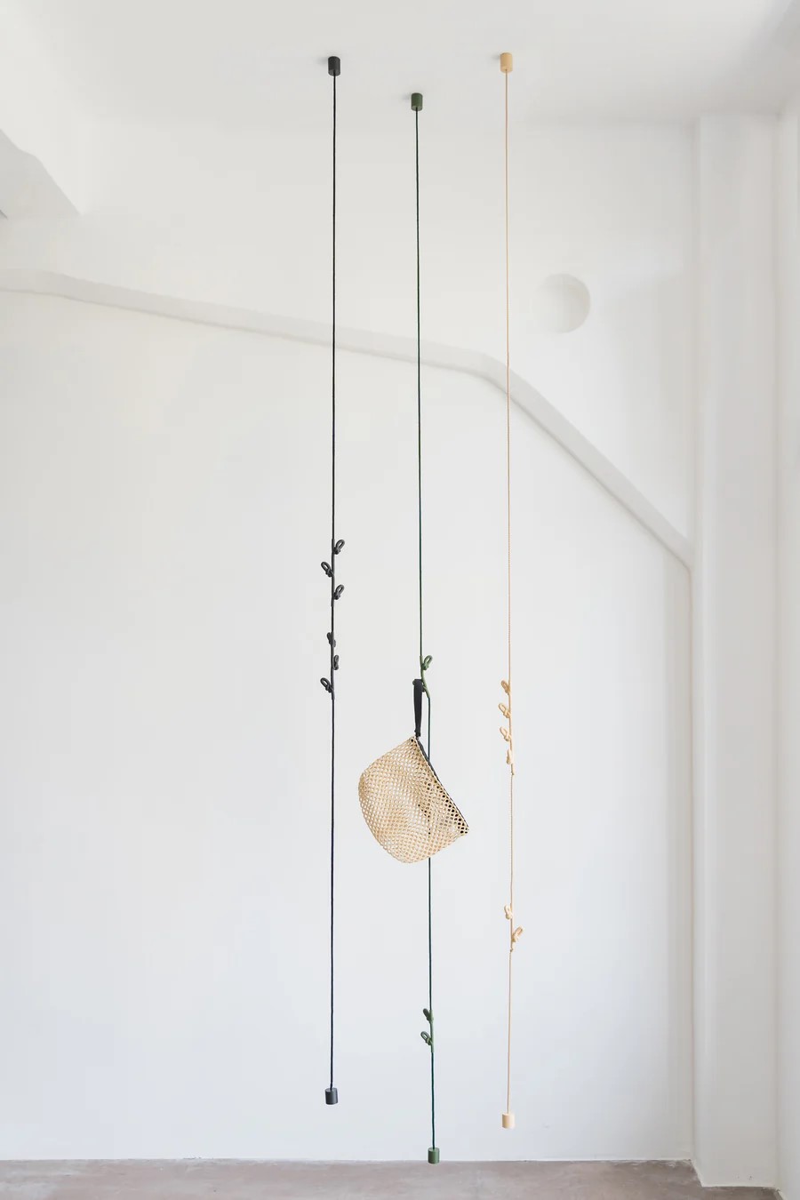Nastavljivo stropno stojalo za plašče je izdelano iz skrbno oblikovanih vozlov, natisnjenih v 3D tehniki, in naravne vrvi. Minimalistično, a igrivo zasnovo navdihujejo jadralski vozli.