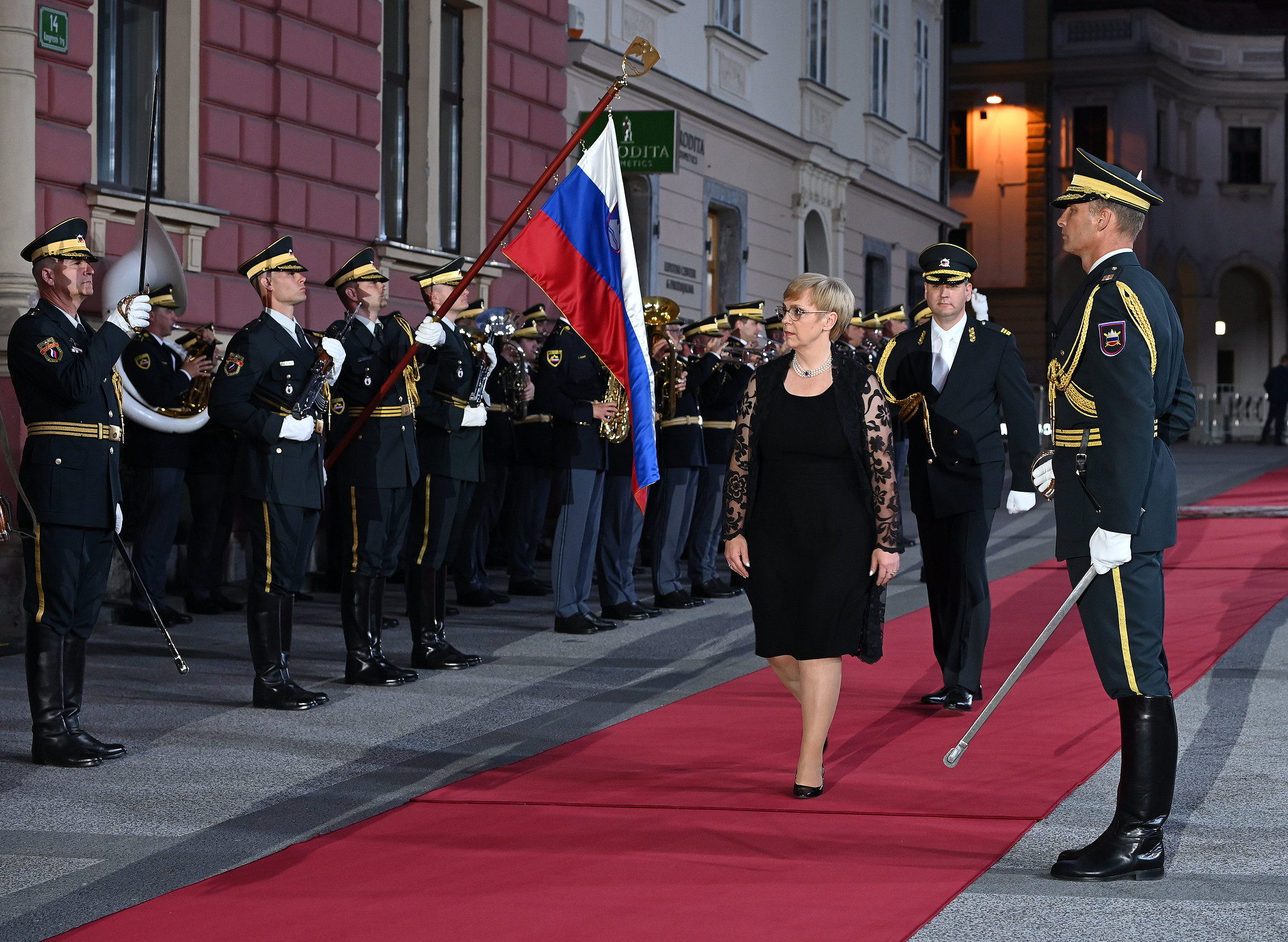 Sicer pa je za proslavo črno obleko izbrala tudi predsednica države Nataša Pirc Musar, ki se je odločila za do kolen dolgo kreacijo s čipkastimi rokavi. K njej je kombinirala biserno ogrlico in črne salonarje.