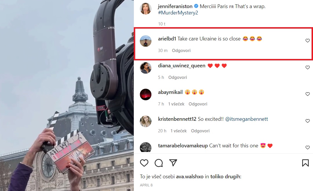Posmehujejo pa se ji tudi na njenem profilu na Instagramu, kjer ji pod objave v zvezi s filmom pišejo komentarje v slogu: “Pazi nase, Ukrajina je blizu.”