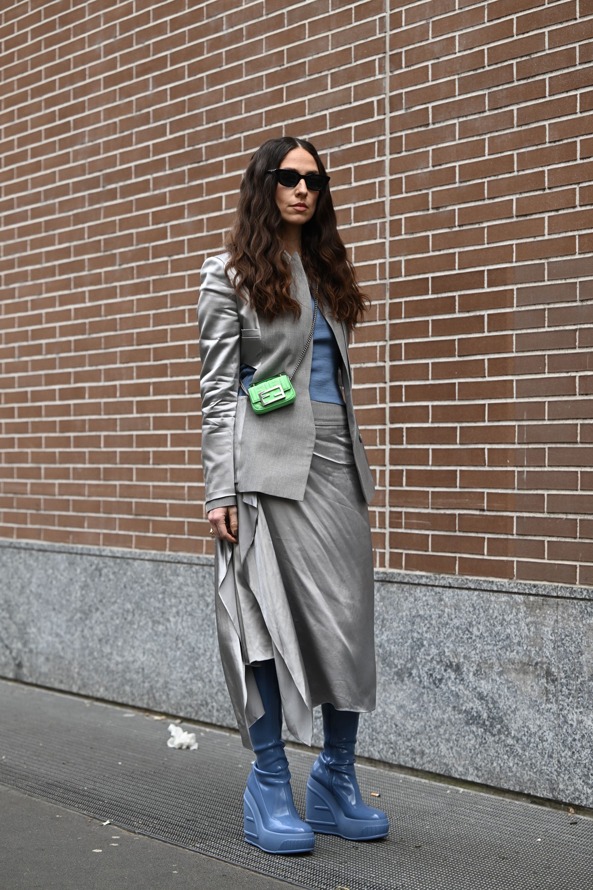 Samostojno, z dodatkom srebrne ali neonsko zelene je siva barva kraljevala na milanskih ulicah. Letnemu času primerno barvo smo videli v vseh mogočih odtenkih, od betonske sive do temnih antracit odtenkov.