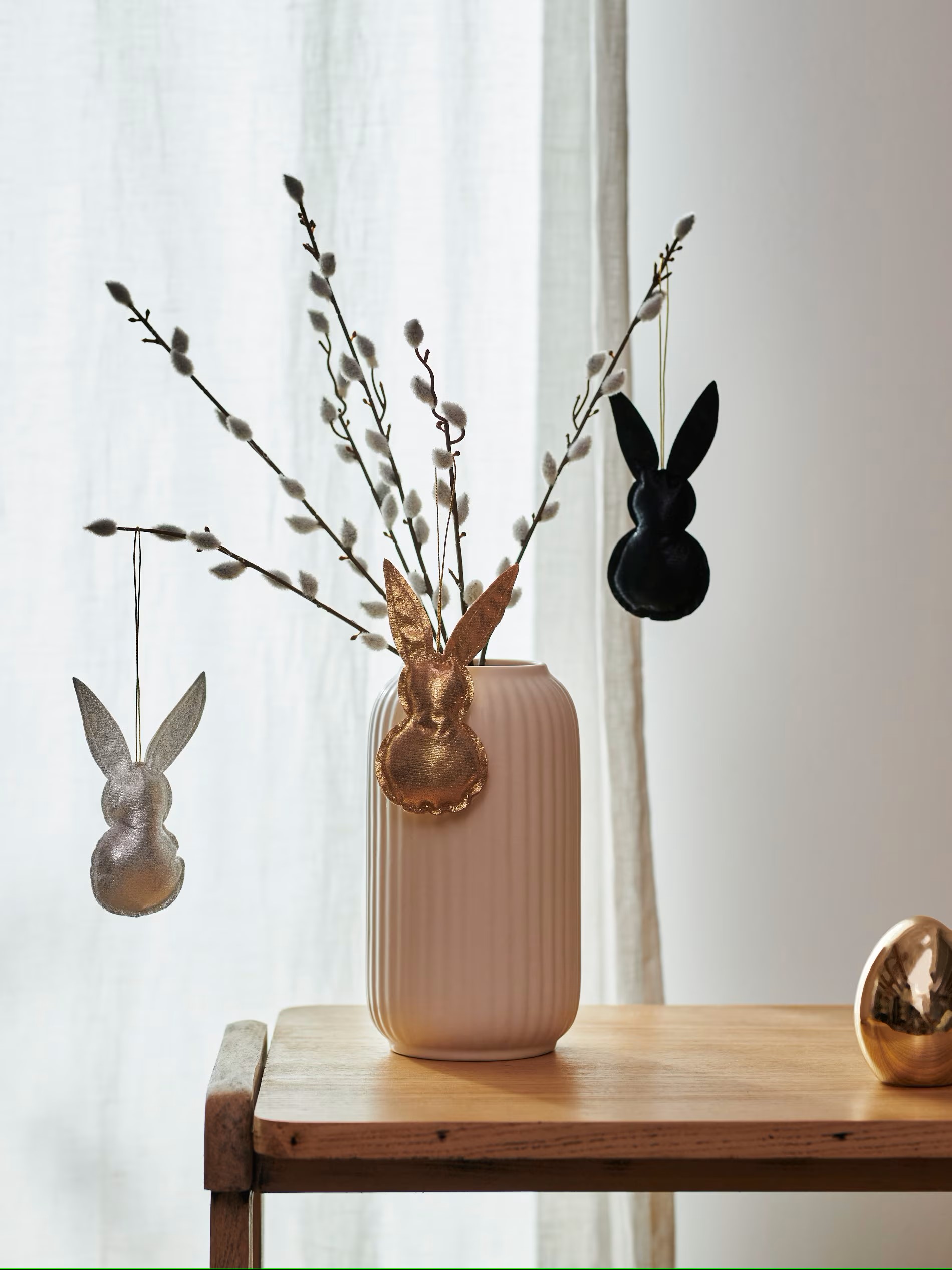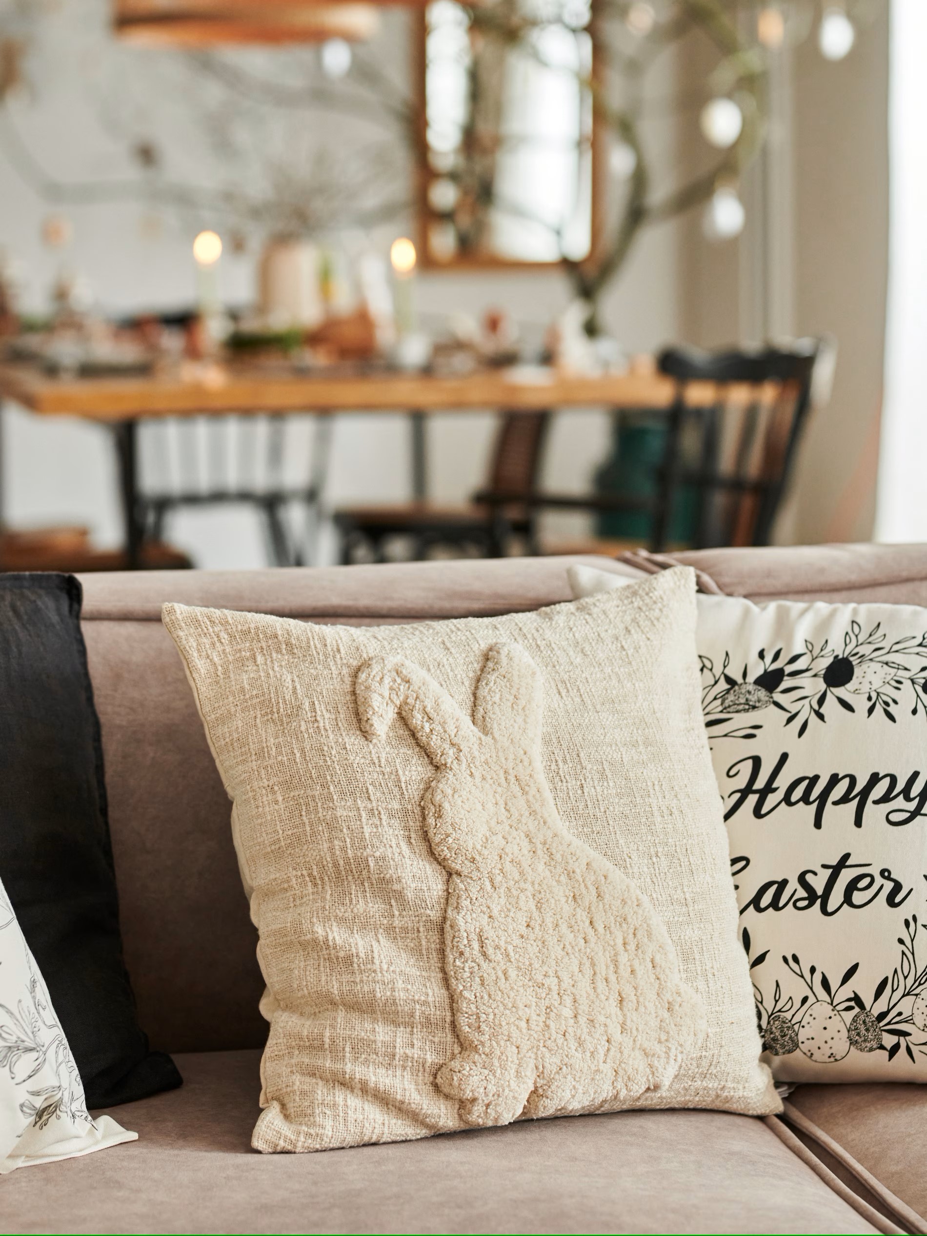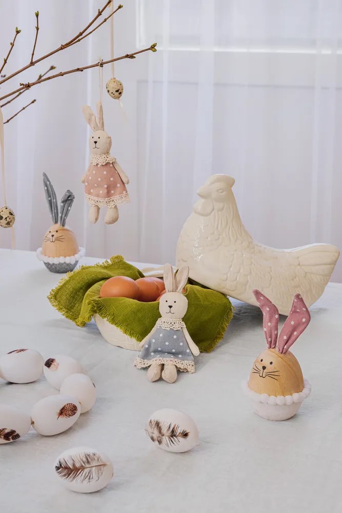Prav tako ne pretiravajte s količino izdelkov v teh kotičkih, eden ali dva zajčka sta povsem dovolj, raje se igrajte s tkaninami in pastelnimi barvami, za elegantnejši videz pa izberite naravne odtenke ali črno-belo kombinacijo.