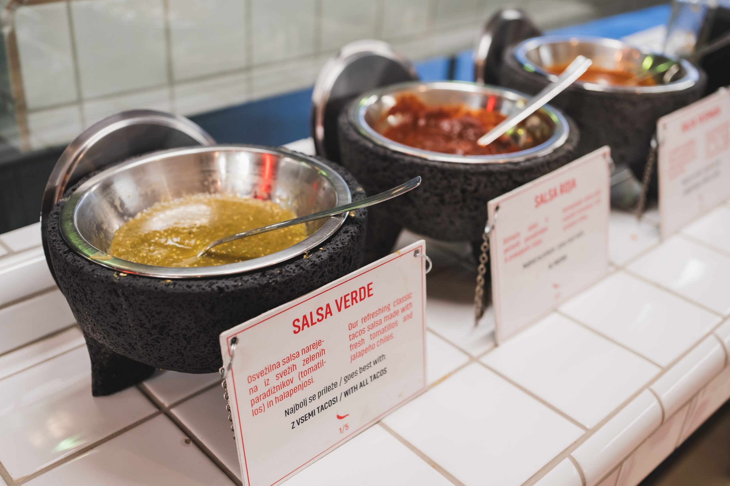 K vsakim tacosu sodi seveda še salsa, značilna mehiška omaka, ki ima številne različice. V Taqueriji Unomas ponujajo v posebnem kotičku tri različne salse, ki so ustrezno označene glede na stopnjo pikantnosti. Intenzivnost ni pretirana, a če ne marate preveč pekoče hrane, pazljivo z doziranjem. Kaja, ki ni ljubiteljica pekoče hrane, je prvo porcijo zamenjala z manj pekočo. Za največje privržence pikantnega okusa imajo dodatno še eno bolj pekočo omako.
