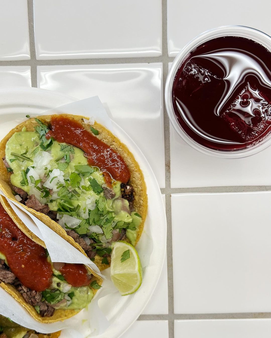 Izbirate lahko med štirimi različni tacosi, a je ribji tacos na meniju zgolj dva dni v tednu, ob torkih (po slovitem običaju na družbenih omrežjih taco tuesday) in petkih. S Kajo sva poskusili tri okuse, ki so bili ta dan na voljo, in sicer Al Pastor, Carne Asada in Vegetal. Jedi dopolnjujejo še značilne mehiške pijače kot so horchata, Aguas de jamica (hibiskusov ledeni čaj s sokom grenivke), brezalkoholnie pijače, mehiško pivo ter obvezna tekila.
