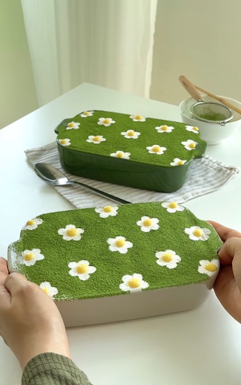 Recept je zelo podoben osnovnemu receptu za tiramisu, le da k njemu dodate še matcho, da z njo ustvarite videz zelene barve … oziroma trave, posute z marjeticami. To je odličen desert, s katerim lahko presenetite svoje goste in s tole prikupno dekoracijo kmalu prikličete pomlad!