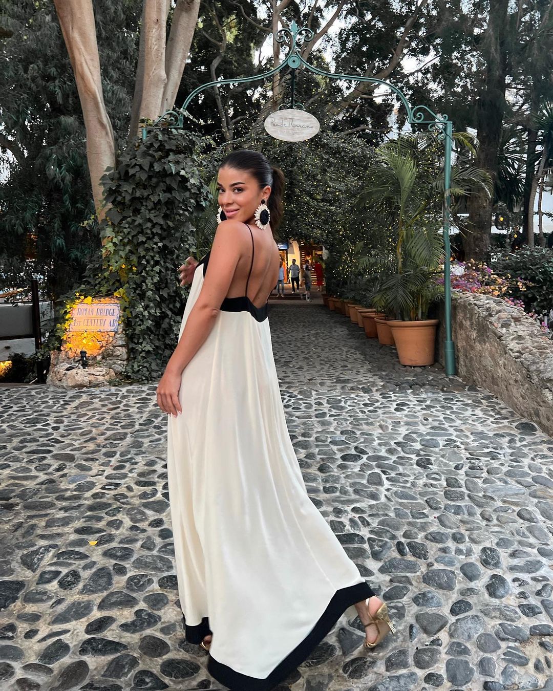 Njihove obleke s kontrastnim V-izrezom in tankimi naramnicami so absolutni “must-have”, še posebej tisti model, ki bo čudovito dopolnil romantičen sprehod ob plaži ali večerni izhod v mesto. Narejena je iz padajočega blaga, midi dolžine in z asimetričnim robom, ki bo poudaril vaš stil in eleganco.