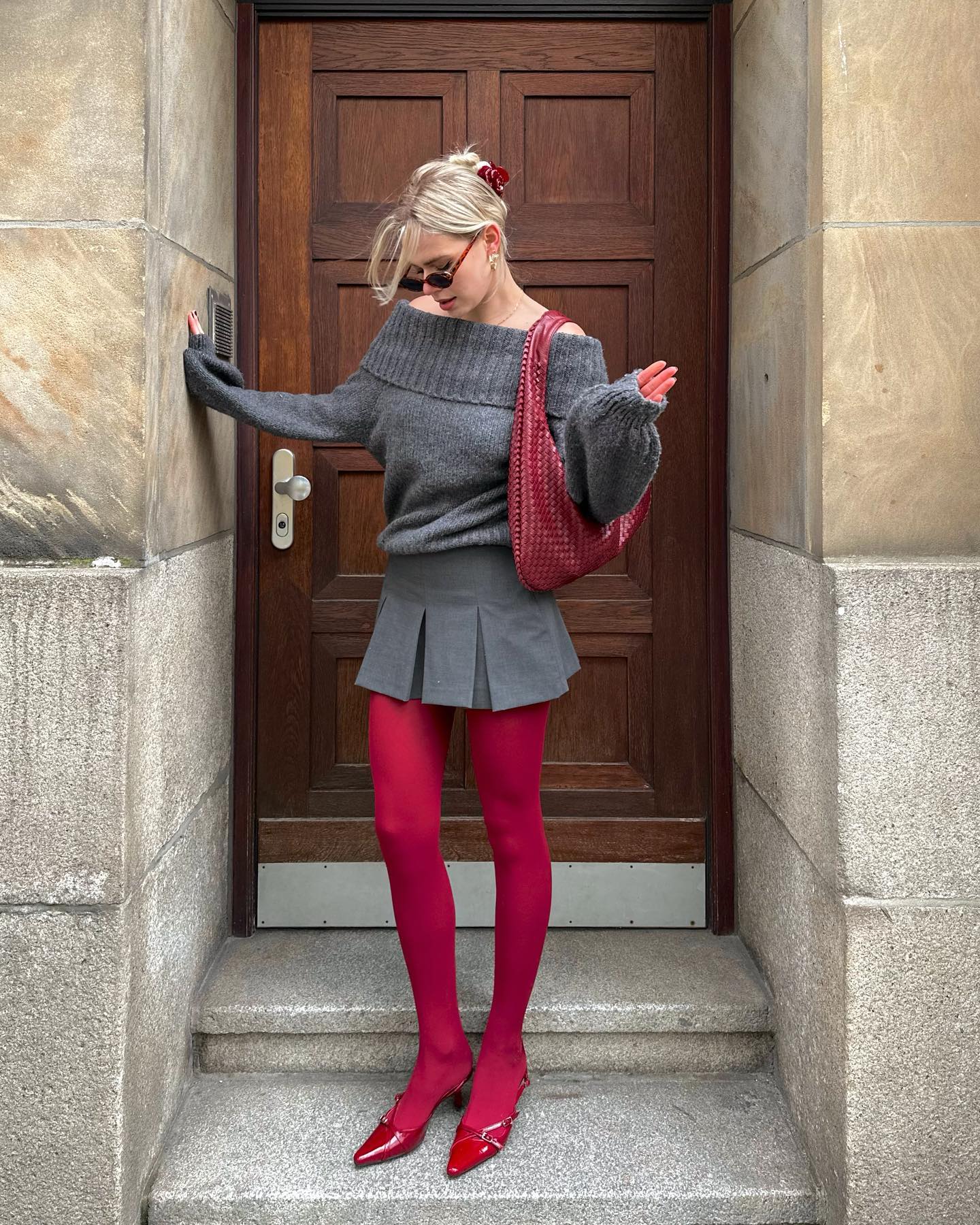 Če želite, da so vaše noge v centru pozornosti, potem rdeče najlonke kombinirajte z nevtralnimi barvami, kot so črna, siva in bež. Bolj pogumne se boste odločile za kratko krilo in kratko jakno, malce bolj sramežljive pa boste k rdečim najlonkam oblekle dolgo pleteno obleko in jo kombinirale z daljšim plaščem. Tako bo izpod vašega outfita kukalo čisto malo rdeče, ki bo pika i k vaši trendovski opravi.