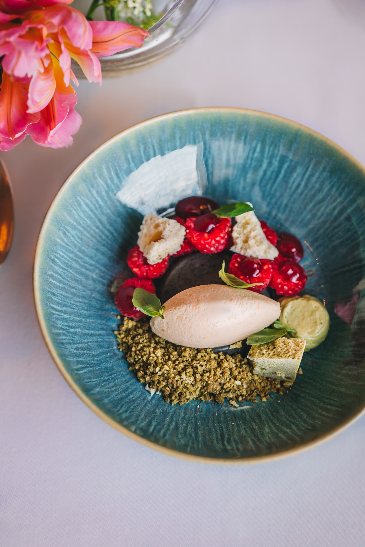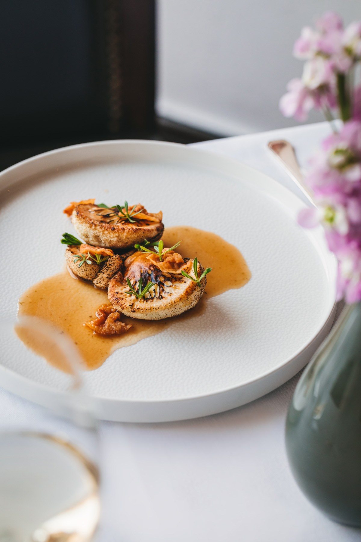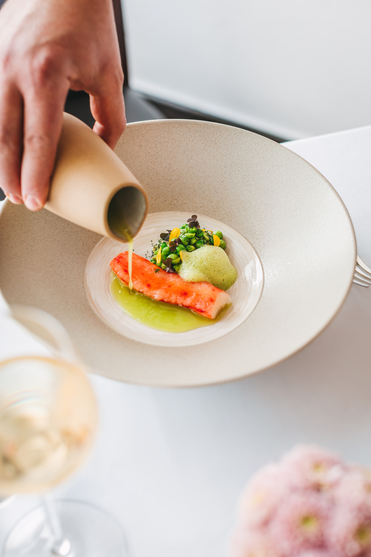 Za pravi okus po morju so tu poširani listi s peno iz limonske trave in bučkinim cvetom ter file morske spake s timutovim poprom v kombinaciji z v olupku pečenim pastinakom, mariniranim z medom in pomarančo.