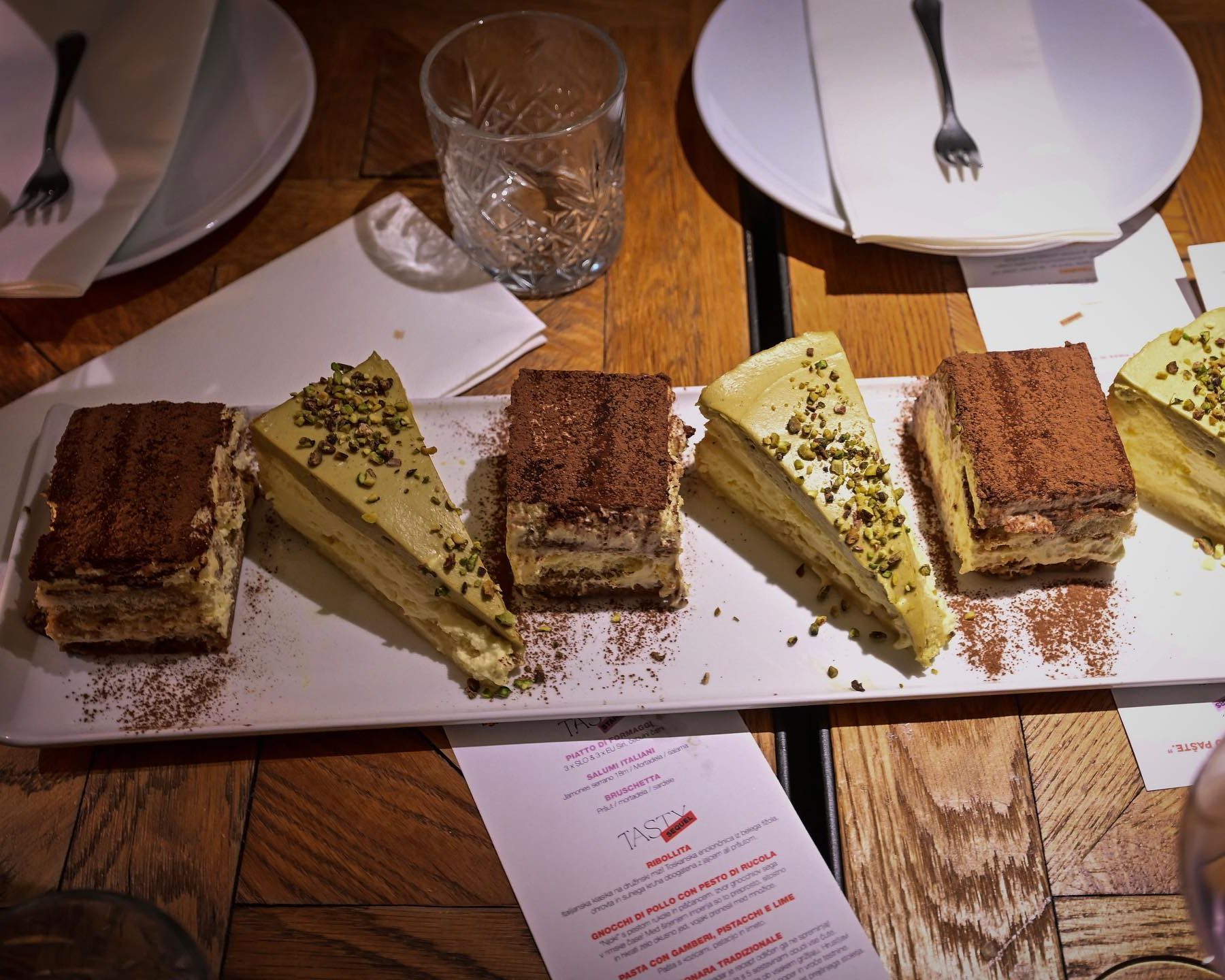 Kljub vsemu nam je na koncu ostal prostor še za sladico. Naročile smo vse, kar imajo na meniju: tiramisu, cannoli s pistacijo, cheesecake s pistacijo in čokoladno torto. Če so bile glavne jedi za desetko, so bile sladice za eno slabo trojko.