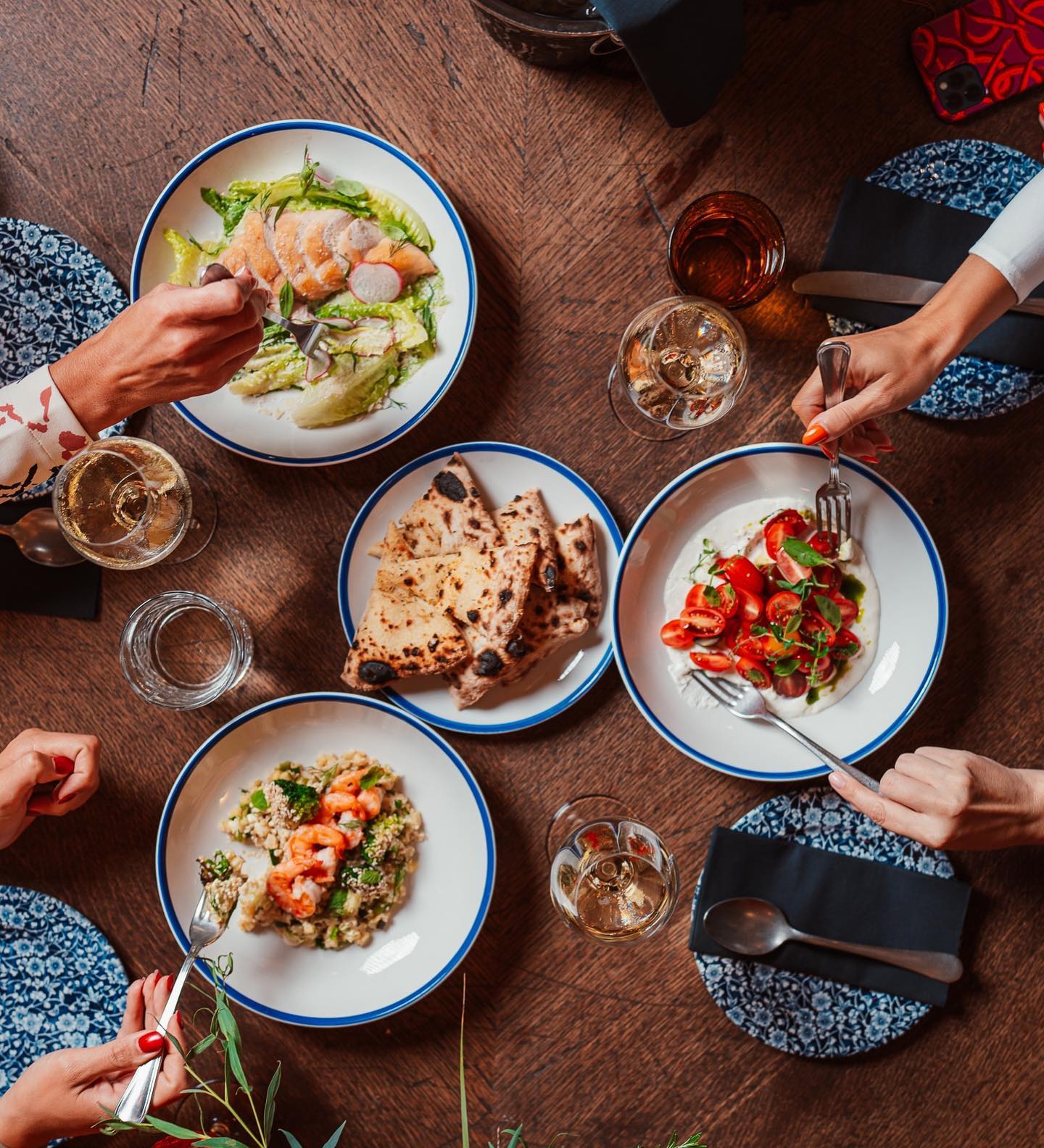 Po dveh izpitih kozarcih se na naši mizi znajdejo: caprese insalata s češnjevimi paradižniki, burato, rukolo in baziliko, cezarjeva solata s piščancem ter pica margerita in pica regina mortadella z mortadelo in kremo pistacije.