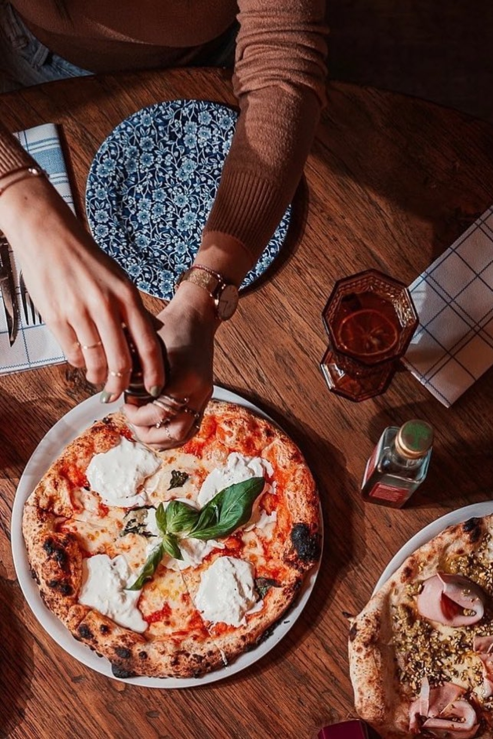 Po dveh izpitih kozarcih se na naši mizi znajdejo: caprese insalata s češnjevimi paradižniki, burato, rukolo in baziliko, cezarjeva solata s piščancem ter pica margerita in pica regina mortadella z mortadelo in kremo pistacije.