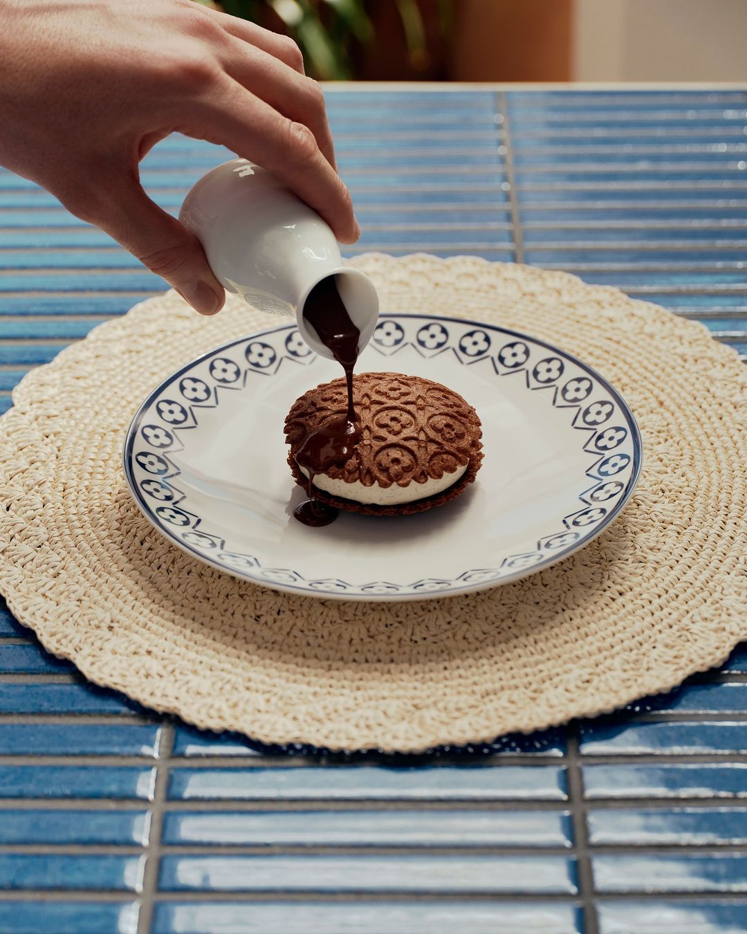 Če je bila restavracija lani urejena v sredozemskem slogu, s svetlo paleto minimalističnih odtenkov in naravnimi materiali, je letos v ospredju modro-bel vzorec. Motiv, ki se pojavlja tako rekoč povsod, vse od namiznega pribora do blazin, se zgleduje po novi aktualni Louis Vuitton kolekciji, imenovani By the Pool.