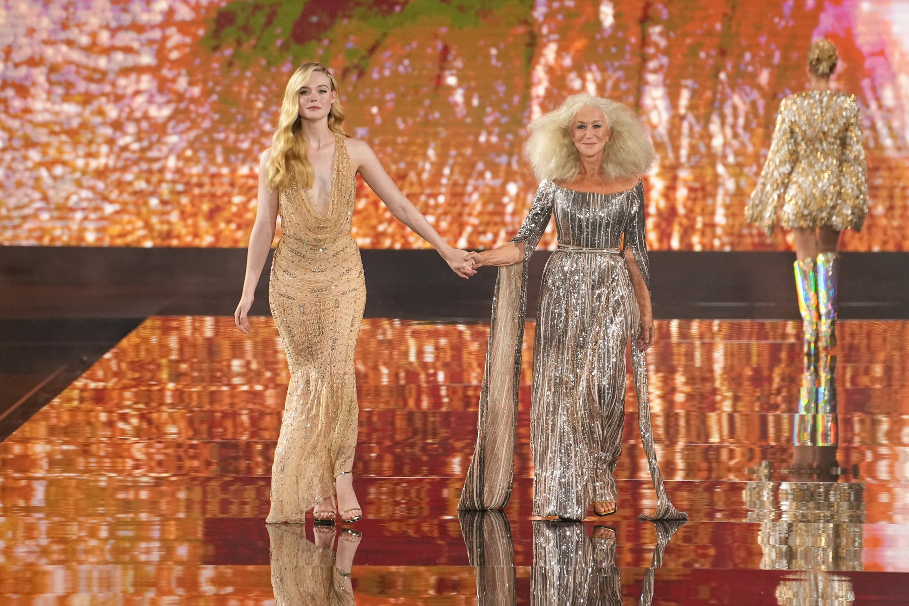 V srebrni in zlati bleščeči kreaciji sta se po modni brvi z roko v roki sprehodili tudi 78-letna Helen Mirren in 25-letna Elle Fanning, Andie MacDowell pa je imela oblečen črn PVC plašč in ujemajoče se hlače.