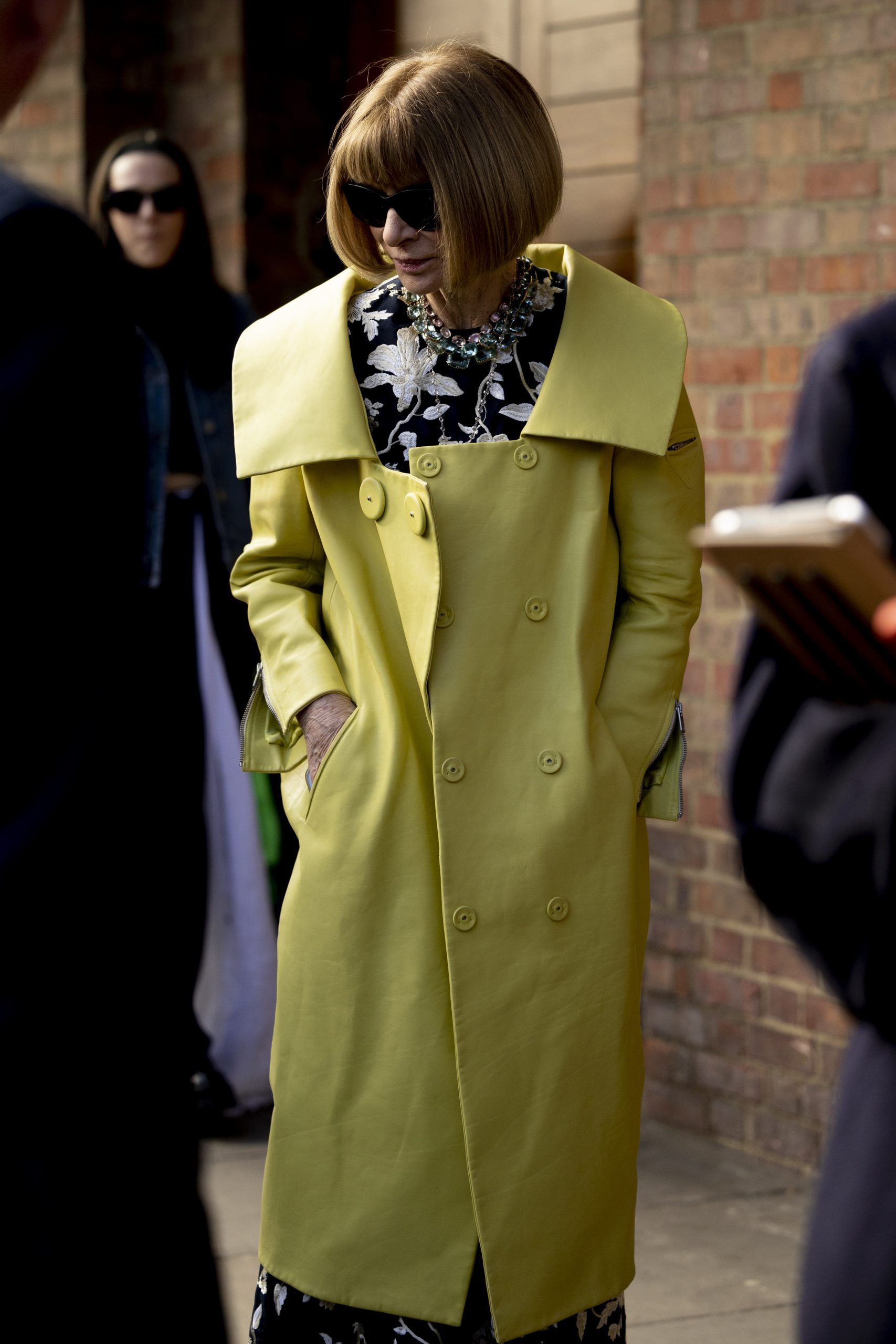 Trenčkot v limetino rumenem odtenku je izbrala tudi najbolj znana modna urednica Anna Wintour. Večno klasiko bež trenčkota z dvorednimi gumbi zamenjajte za drzne barve, geometrijske vratnike in voluminozne različice.