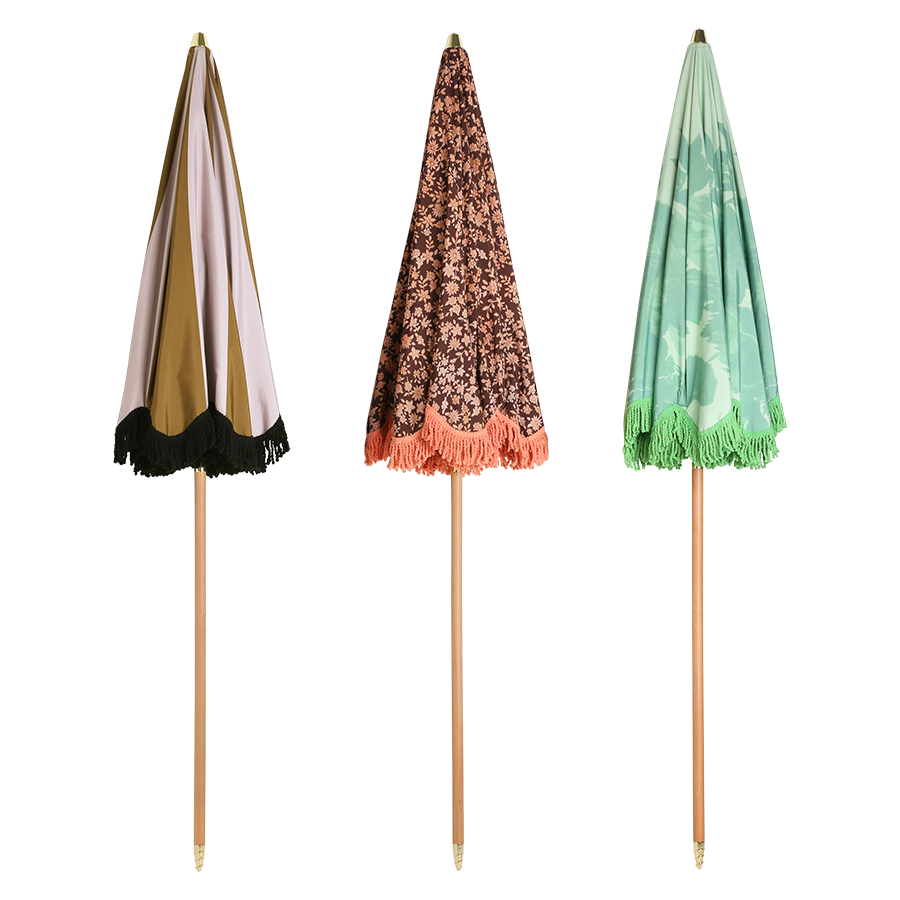 Ne glede na to, ali imate radi klasične črte, drzne geometrijske potiske ali nežne cvetlične motive, njihova zbirka ponuja nekaj za vsak okus in stil zunanjega prostora. Senčniki so prava umetnina, izdelani so iz kakovostnega bukovega lesa, jeklenih žic in poliestrske tkanine, enega izmed najbolj tropskih modelov pa prekriva umetna rafija.