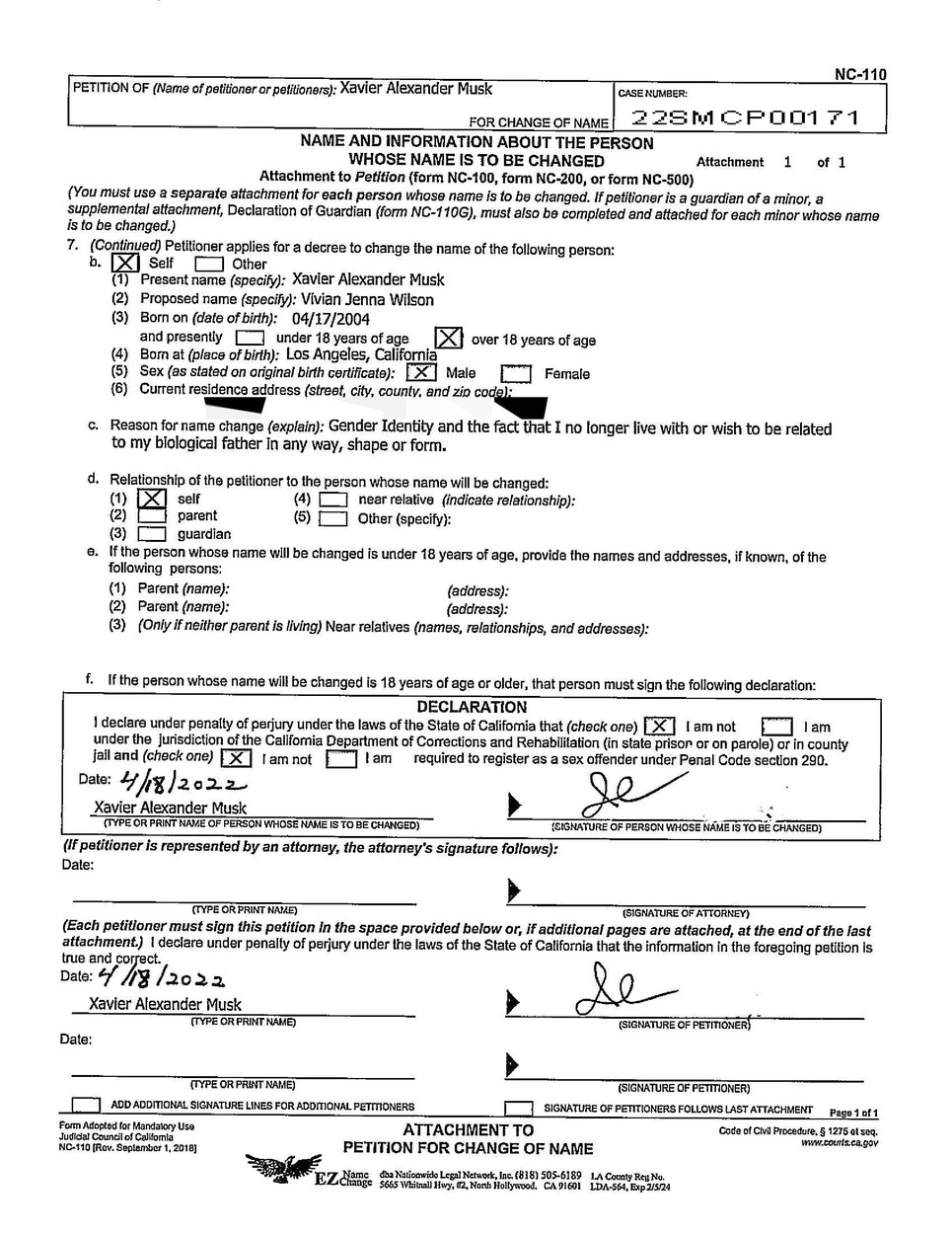 Xavier Musk se je preimenovala v Vivian Jenna Wilson ter za uradno priznanje spremembe spola in imena zaprosila tudi kalifornijsko sodišče. Obenem pa je izrazila tudi željo, da uradno prekine vezi z očetom, slavnim milijarderjem Elonom Muskom.