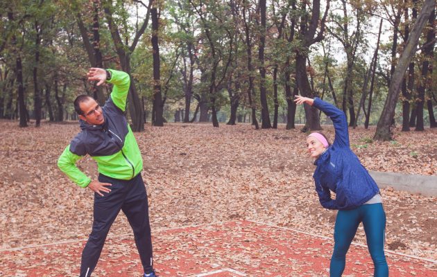 - Počep: postavite se v počep in poskočite, tako da imate uteži na ramenih. Ko se dvignete iz počepa, dvignite uteži nad glavo.