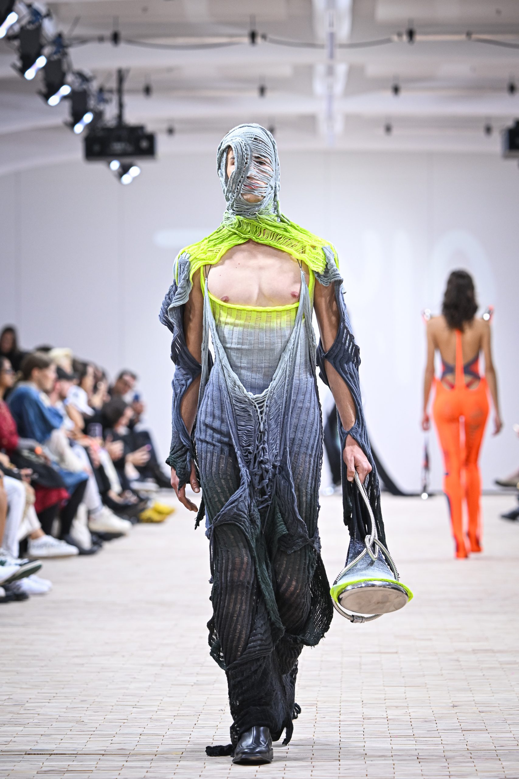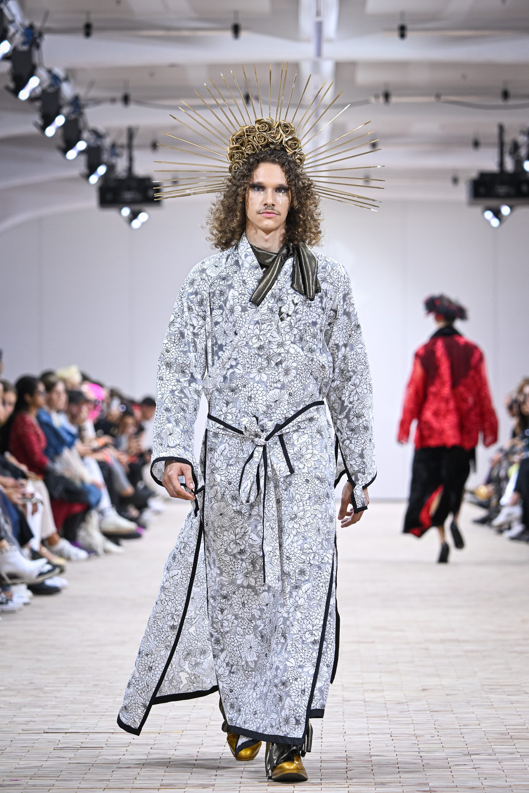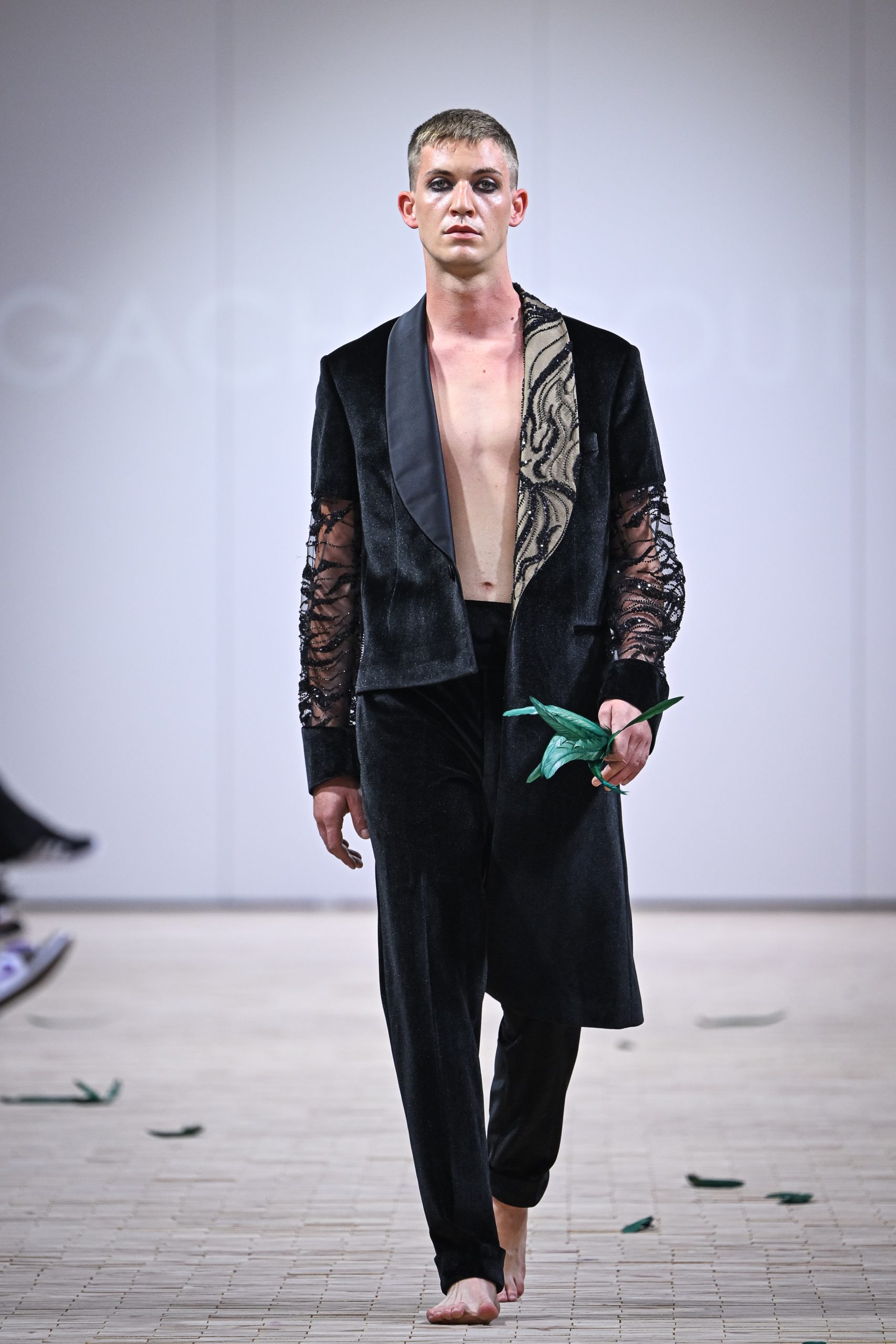 Dejan Petrović, ki ustvarja pod imenom Princederosenoires in se v svoji oblikovalski praksi osredotoča na raziskovanje fluidnosti spola in čustev, je na brv poslal kolekcijo “Kintsugi”. Navdih je našel v istoimenski starodavni japonski umetnosti popravljanja razbite keramike, kjer se nepopolnosti poudarijo s pasto v zlatem odtenku.