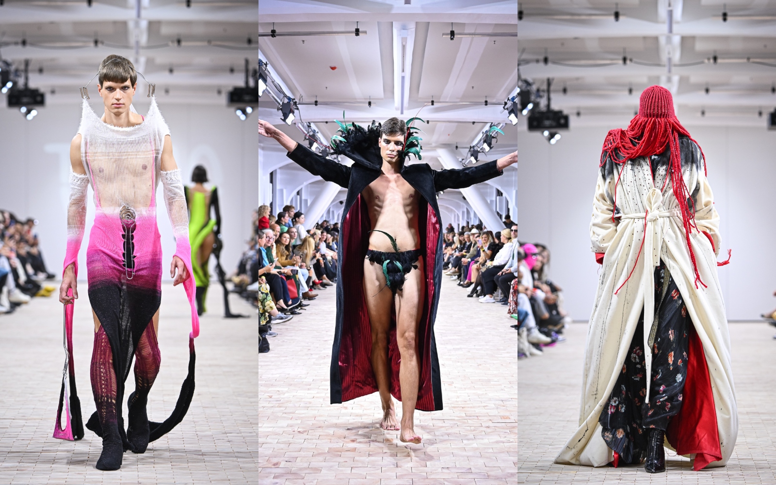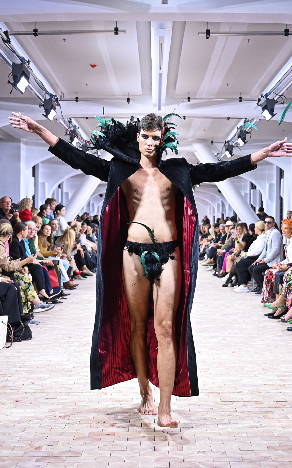 Dejan Petrović, ki ustvarja pod imenom Princederosenoires in se v svoji oblikovalski praksi osredotoča na raziskovanje fluidnosti spola in čustev, je na brv poslal kolekcijo “Kintsugi”. Navdih je našel v istoimenski starodavni japonski umetnosti popravljanja razbite keramike, kjer se nepopolnosti poudarijo s pasto v zlatem odtenku.