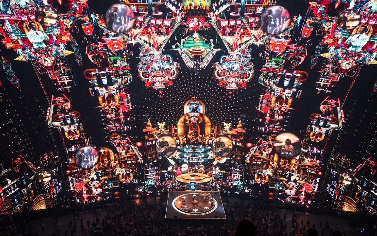Na visokih neonskih zaslonih, ki ustvarjajo občutek ujetosti v računalniški igrici ali medgalaktičnem prostoru, so se v več kot dveh urah zvrstile številne barvite animacije. Med drugim so animacije vključevale ameriško zastavo, podobo Elvisa Presleya s prizori starega Las Vegasa, pisane metulje v družbi ptic in plazilcev in pisanih črk in številk v stilu Matrice, ki so ustvarile nepredstavljivo magično doživetje.