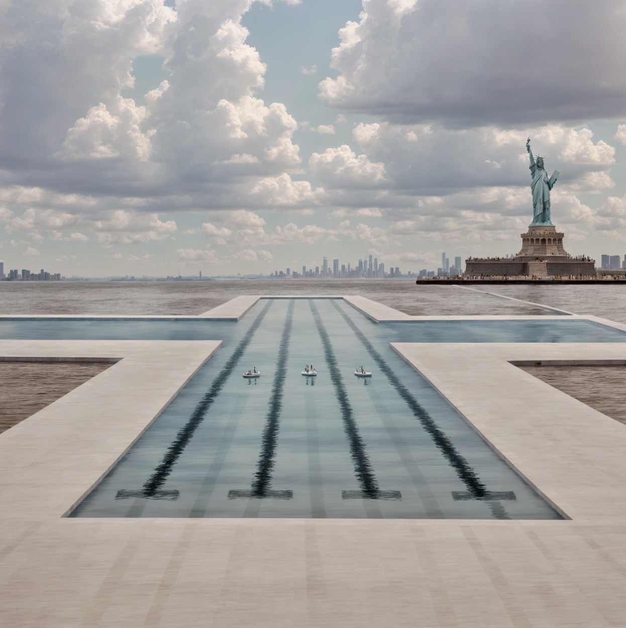 Dokončanje je predvideno že za letošnje poletje, plavajoči bazen v obliki križa bo vodo filtriral skozi svoje stene in tako brez kemikalij ali dodatkov očistil več skoraj 380 000 kubičnih metrov vode na dan.