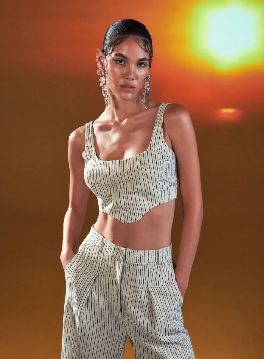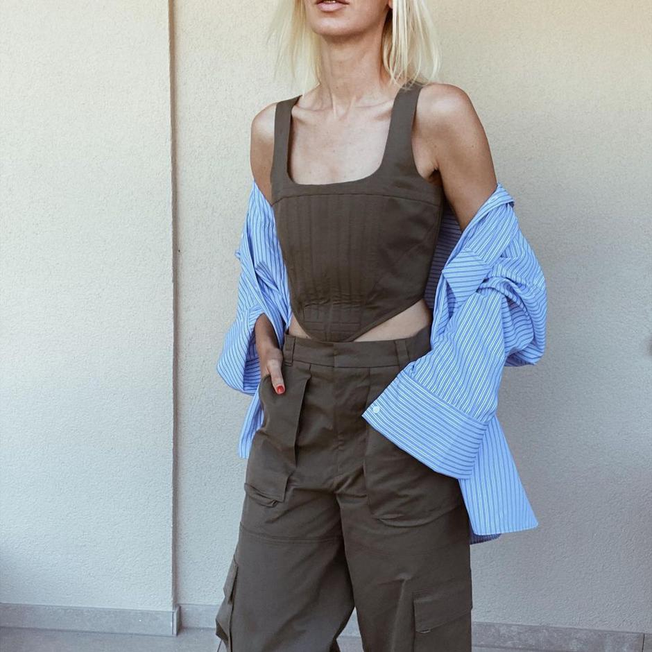 Korzet najpogosteje kombiniramo s preprostimi kavbojkami, za učinek Y2K mode, pa najbolje izgleda s širokimi kargo hlačami. Za bolj elegenten in seksi videz ga kombinirajte k elegantnim širokim hlačam strogega ravnega kroja.