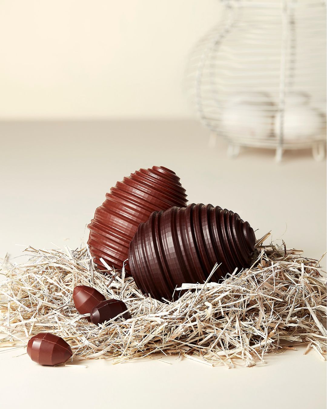 Minimalistična moderna velikonočna jajčka je nastala izpod rok mojstra Alexandreja Dufeuja, ki je glavni slaščičar v enem izmed dubajskih ekskluzivnih hotelov. Delikatno jajce je sestavljeno iz krhkih čokoladnih lističev, ki se elegantno spiralno ovijejo v jajčno obliko.