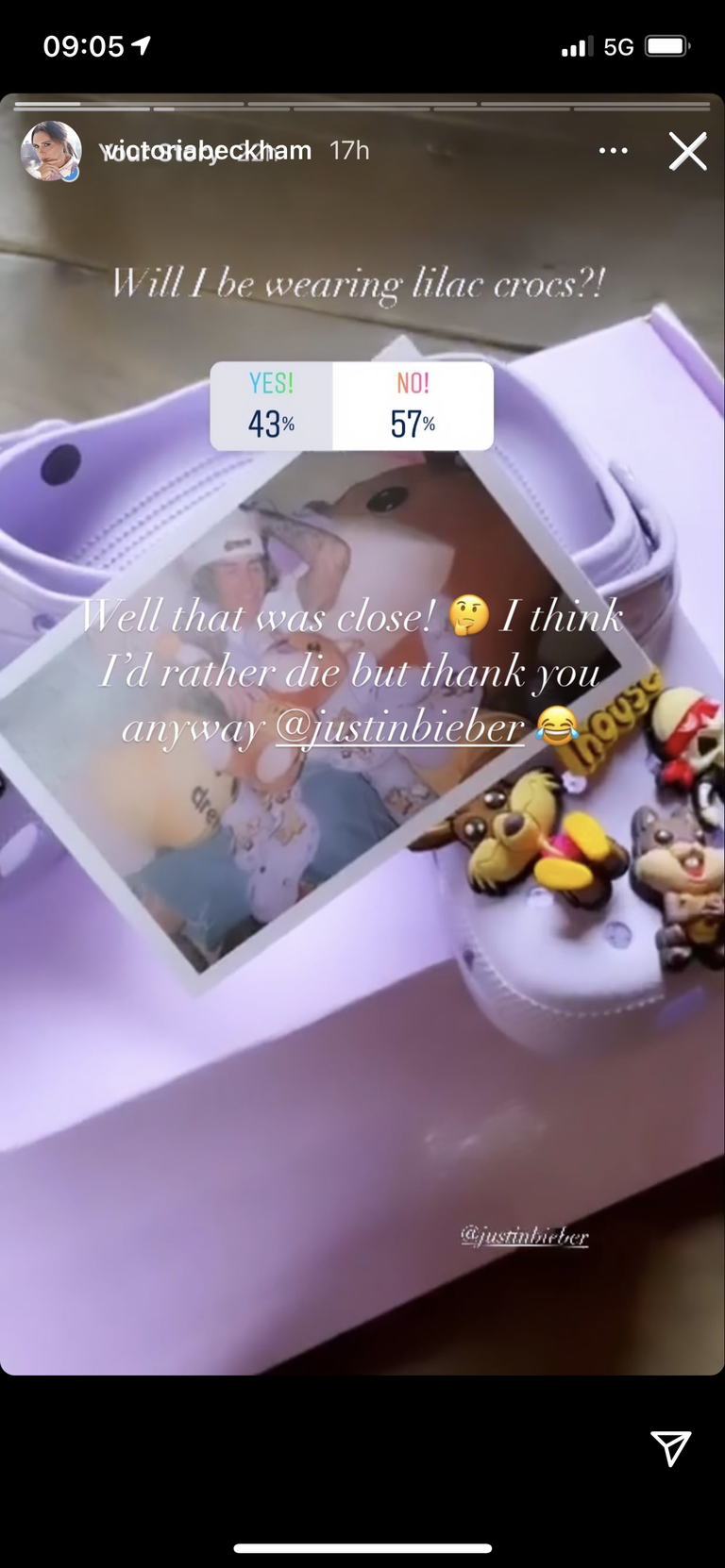Pevec in lastnik modne znamke Drew House Justin Bieber, je pred kratkim za namen promocije manekenki Victorii Beckham poslal par Crocsev v barvi sivke, ki so bili okrašeni z zaponkami narisanih živalic. Nekdanja pevka in modna oblikovalka pa se je odzvala tako, da je na svoj Instagram Story delila anketo, v kateri je spraševala, ali naj jih obuje.