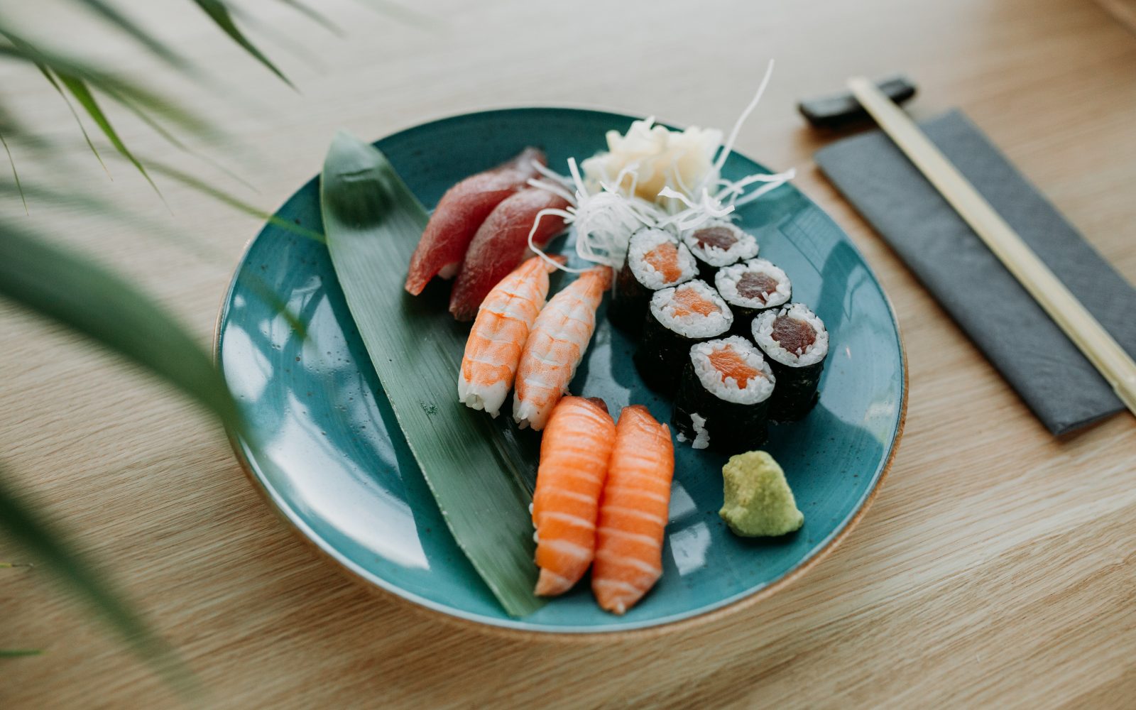 Sedaj vam ostane le še zvijanje riža, za kar potrebujete bambusovo podlogo, liste alg, svežo zelenjavo in ribe.