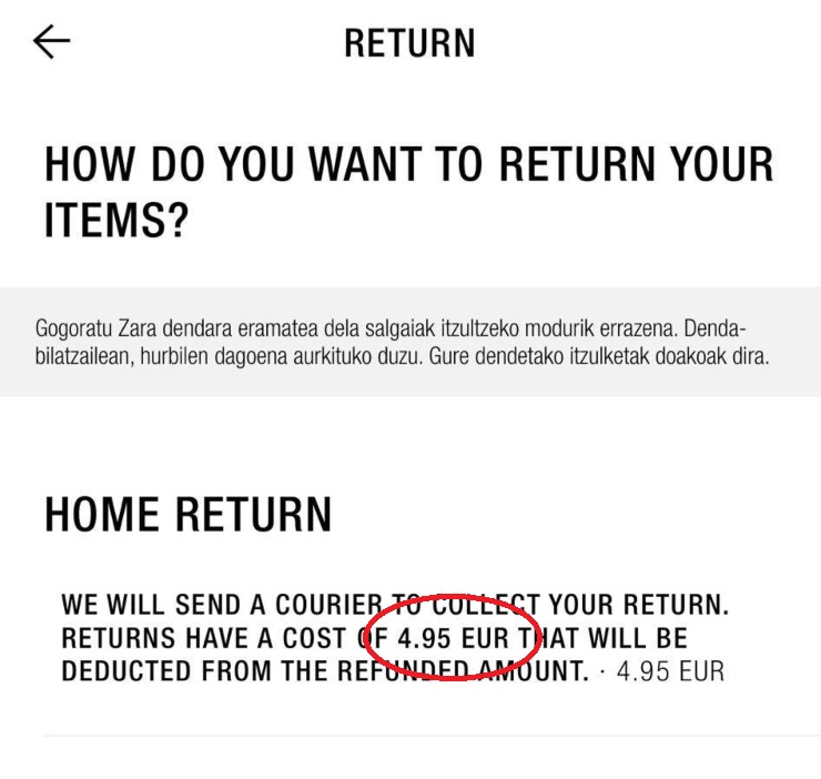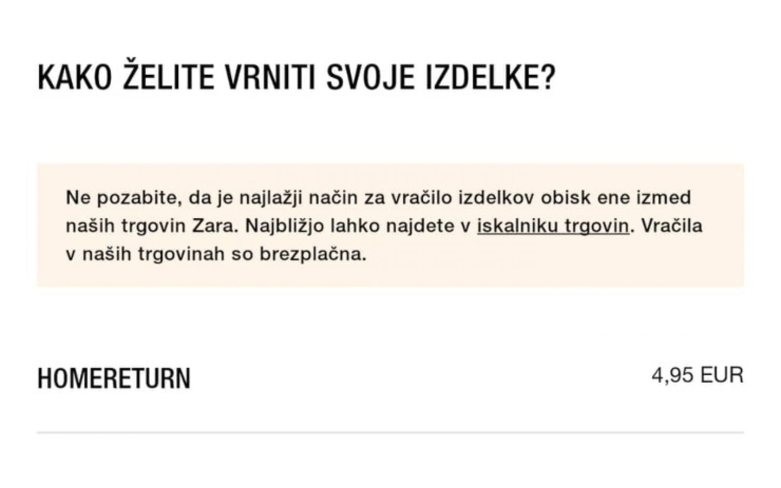 A dobra novica je, da to velja le za artikle, vrnjene preko dostavne službe. Spletna vračila v fizičnih Zarinih trgovinah namreč ostajajo brezplačna.