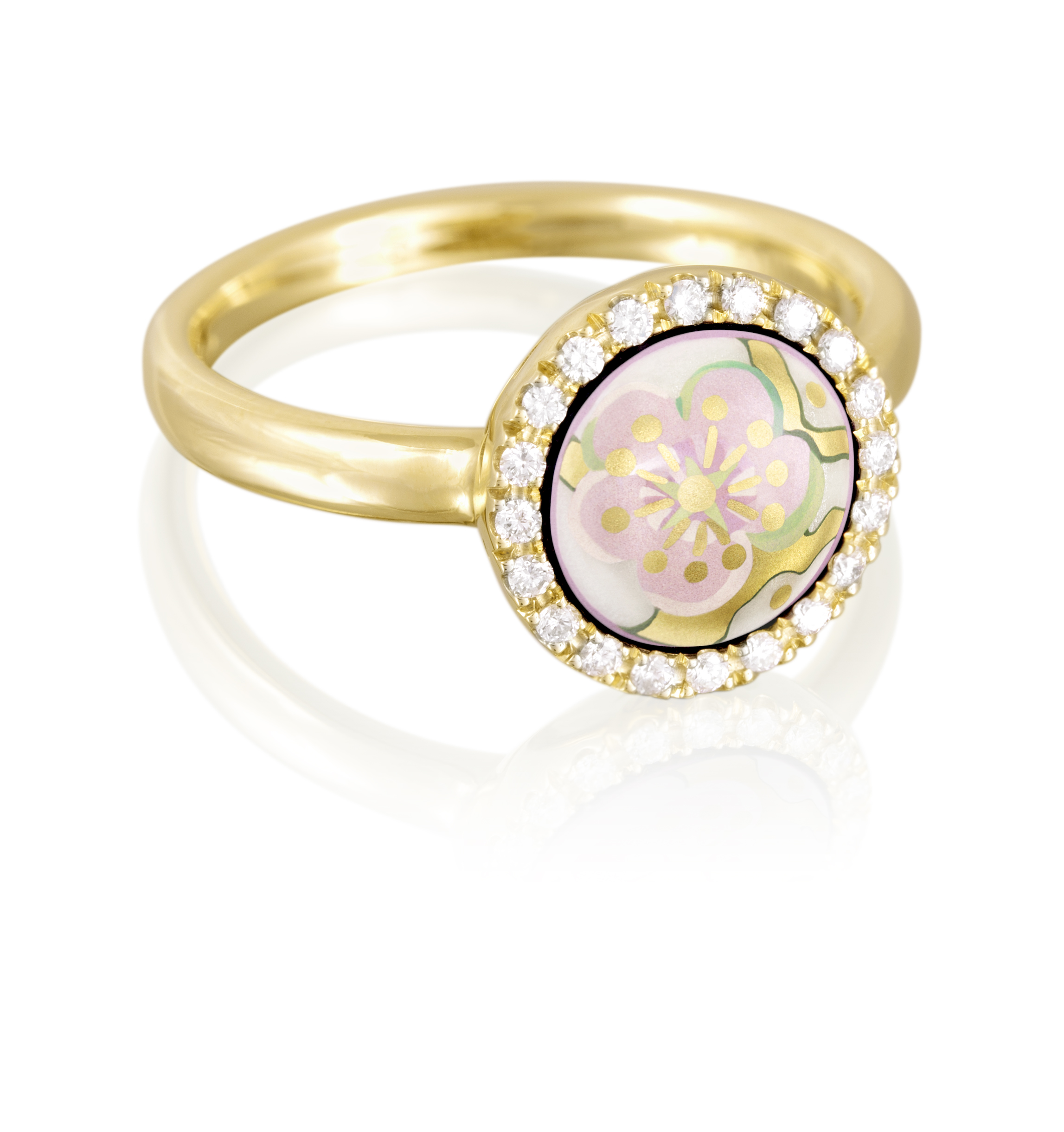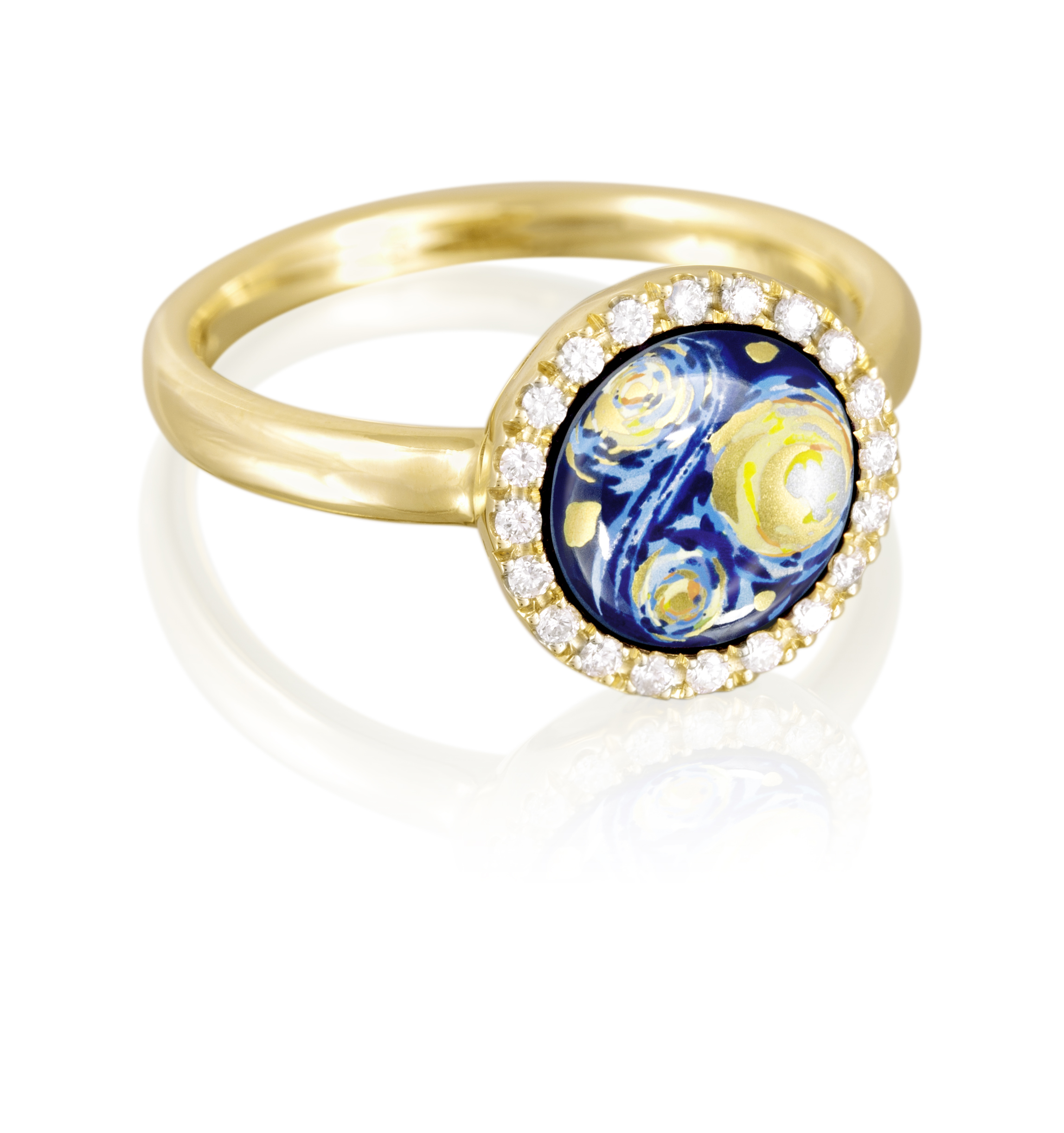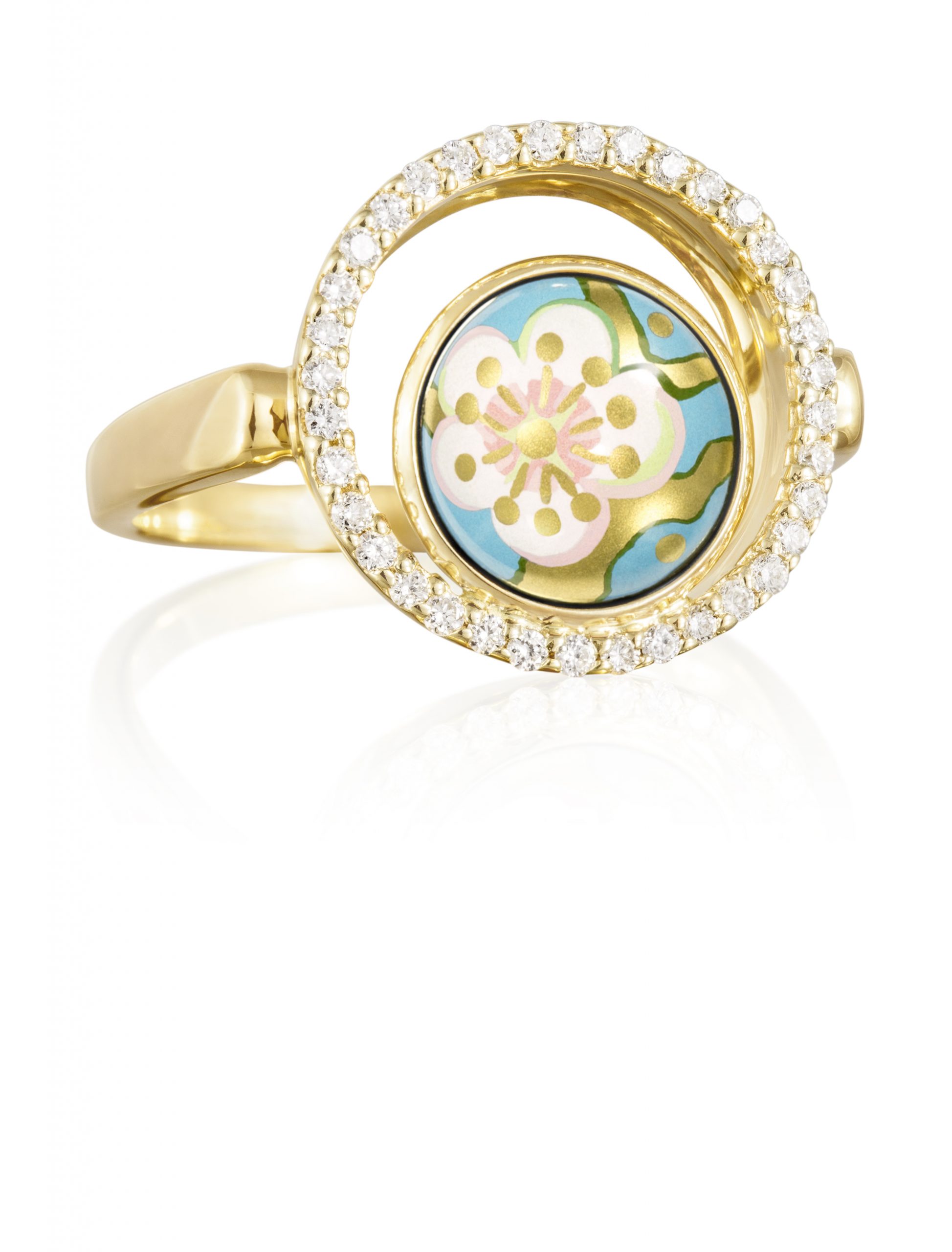 Dizajn prstana FREYWILLE Star Aura je bil navdihnjen z rojstvom zvezd. Na minimalističnem in elegantnem okvirju iz 18-karatnega zlata je spredaj nameščen razkošen okrogel okras iz plemenitega emajla. Vsaka podrobnost tega ročno poslikanega emajla je izdelana z največjo natančnostjo in vedno znova preseneti s svojimi neverjetnimi barvnimi kombinacijami.