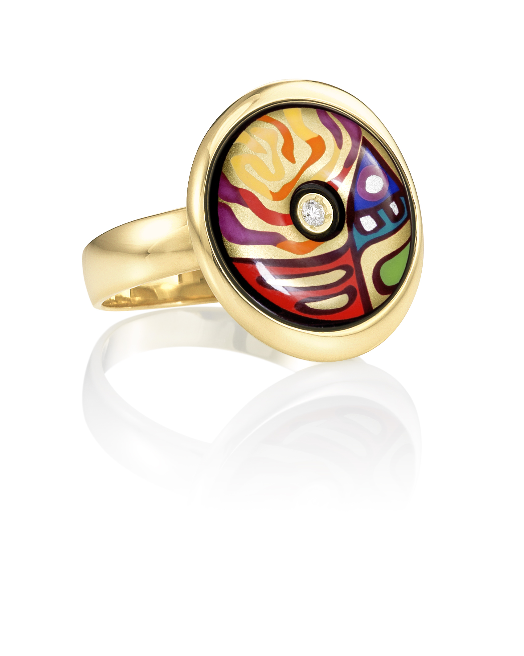 Prstan FREYWILLE Tango vas s svojo kreativno asimetrično obliko vabi, da se z njim igrate sami in ga spremenite v več zanimivih oblik, odvisno od kota vrtenja. Hkrati boste opazili čarobni bleščeči učinek, ki ustvarja svetlobo s harmonično sestavo 18-karatnega zlata in živobarvnega emajla.