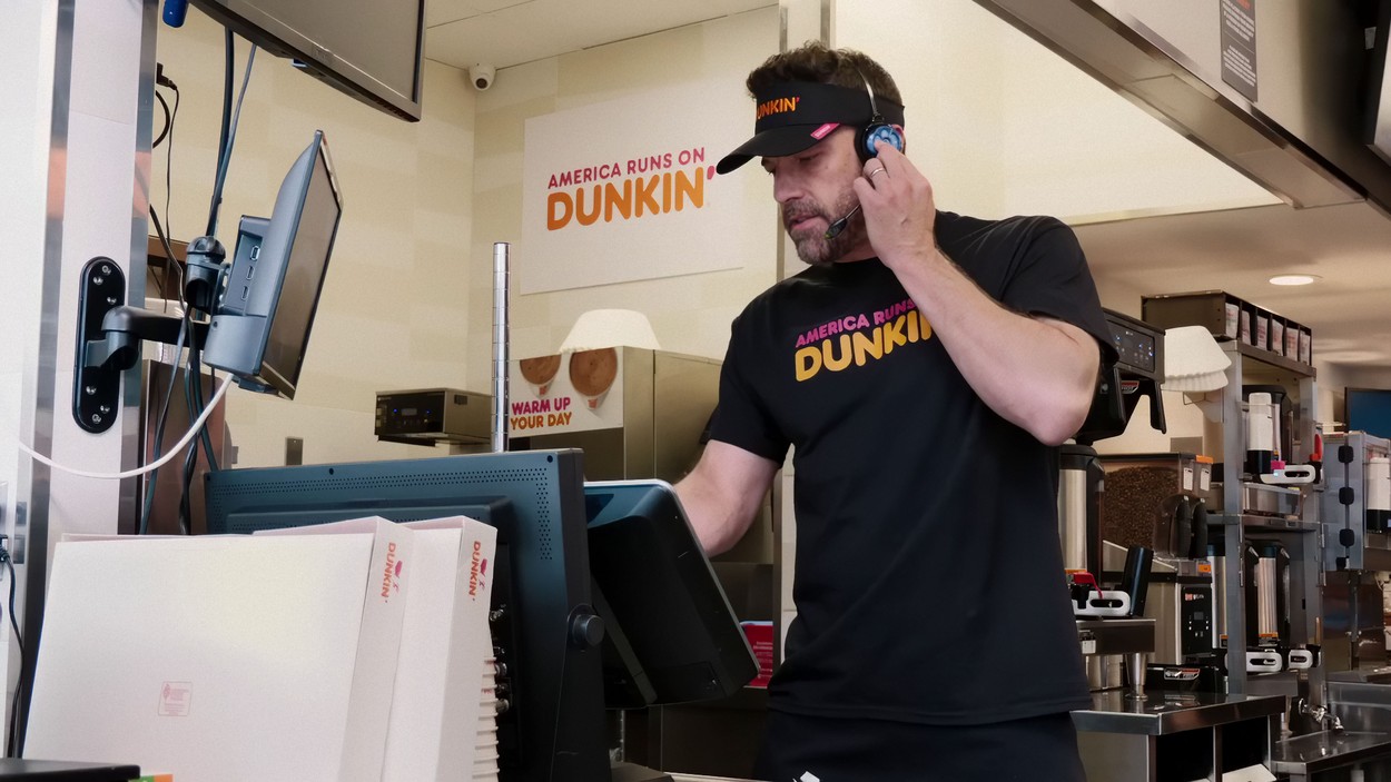 V reklami Affleck dela na drive-thru okencu, sprejema naročila in skupaj z oboževalci, ki ga prepoznajo, naredi nekaj selfijev. Po krofe in kave se pripelje tudi njegova žena Jennifer Lopez, ki se pošali: “A to počneš, ko rečeš, da boš delal cel dan?”
